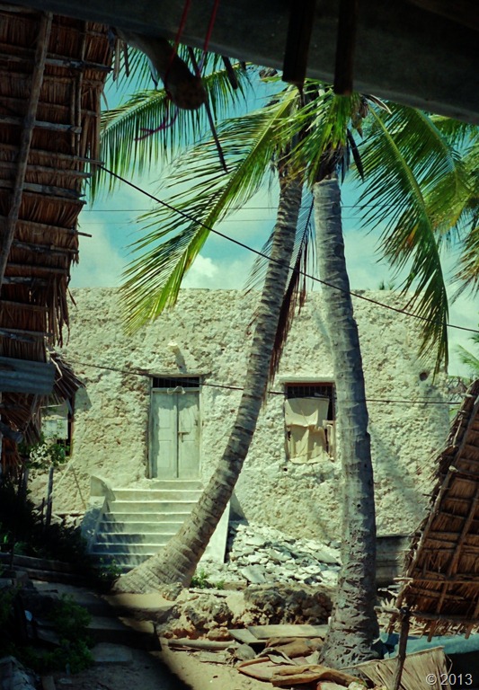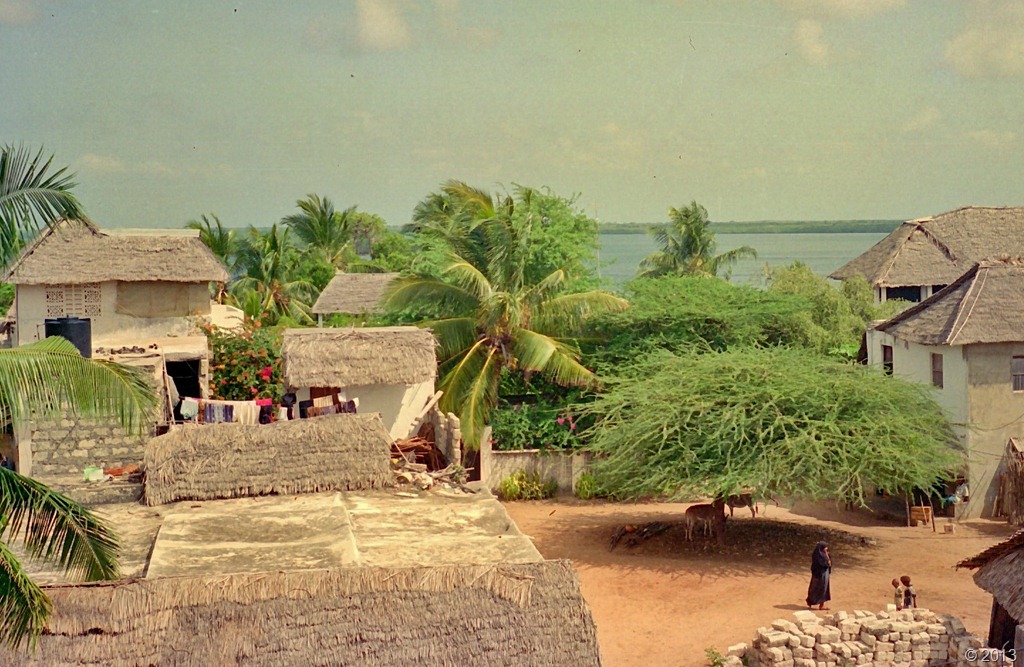 Shela village square from our room with many views. In the foreground is a  stack of the coral rag building blocks from which  most of the houses are built. The spreading thorn tree was the place where the donkeys were parked until needed for transport.