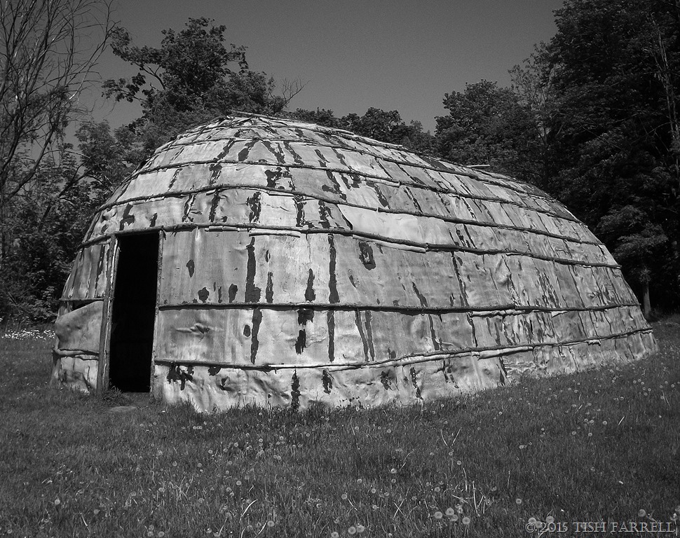 The Iroquois called and call themselves Haudensaunee. (See the Haudensaunee Confederacy website for more about their culture). I read that this name translates as: ‘People of the longhouse’. It is a fitting name for a culture whose architecture so clearly defines their communal ethos. Traditionally, longhouses were as long as there were extended family groups to occupy them – between 60 and 300 feet. The frame was made of bent saplings with a span around twenty feet wide and high. On either side the door, platforms ran the length of the house, with one family to every section. Every two families facing one another across the corridor shared one of many central hearths. The Lawson example, though, is apparently more typical of longhouses found in northern Ontario since it uses a covering of birch bark rather than elm that was used in the south west.