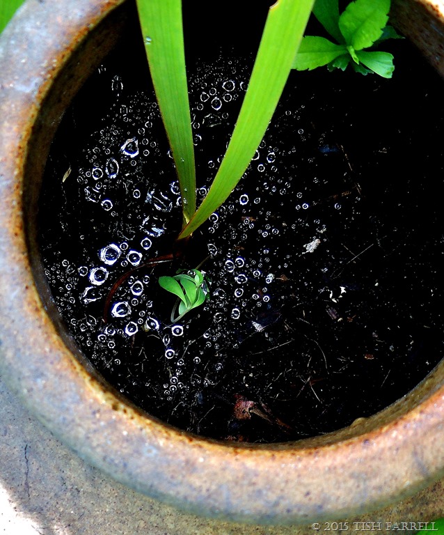 And here’s more evidence of spider activity: ambush exposed by raindrops in a garden pot.