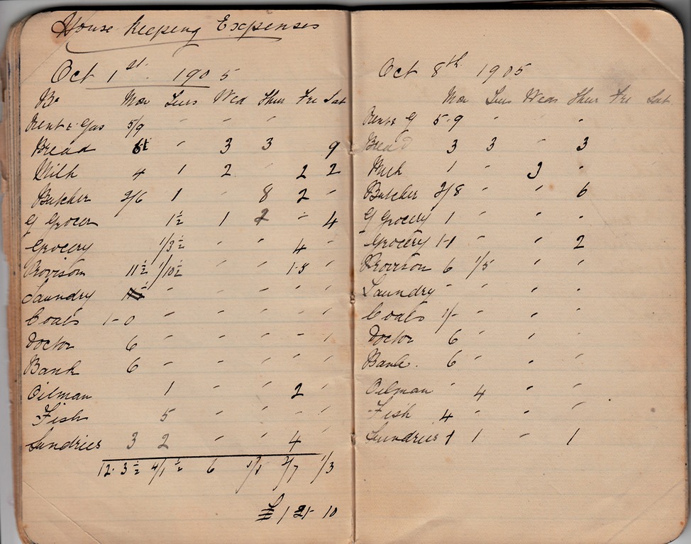 Recently amongst my aunt’s papers I discovered a telling glimpse into Alice and Charlie’s first weeks of married life on Sunnyhill Road. I found it in a small notebook that I had thought contained only my grandmother’s small archive of family recipes. However, several pages in, and following on from the instructions for making plum pudding, boiled brisket and apple pancakes, I came upon five weeks of household accounts, covering the second month of their marriage from October-November 1905.
