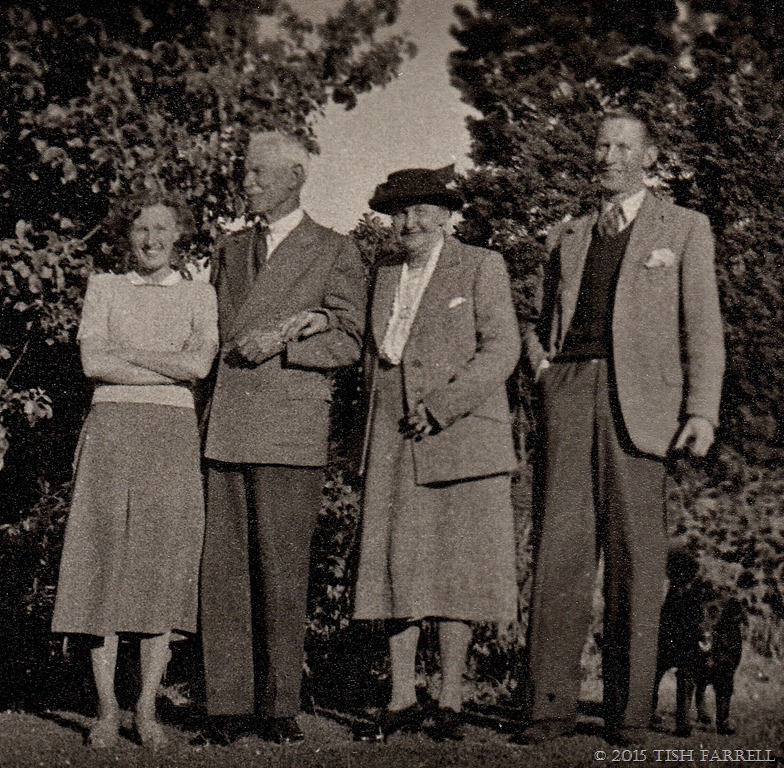 Alice with Charlie in 1949, the year she died. Flanked by my parents, Peggy and Alex and RAF the dog. Alice is 66.