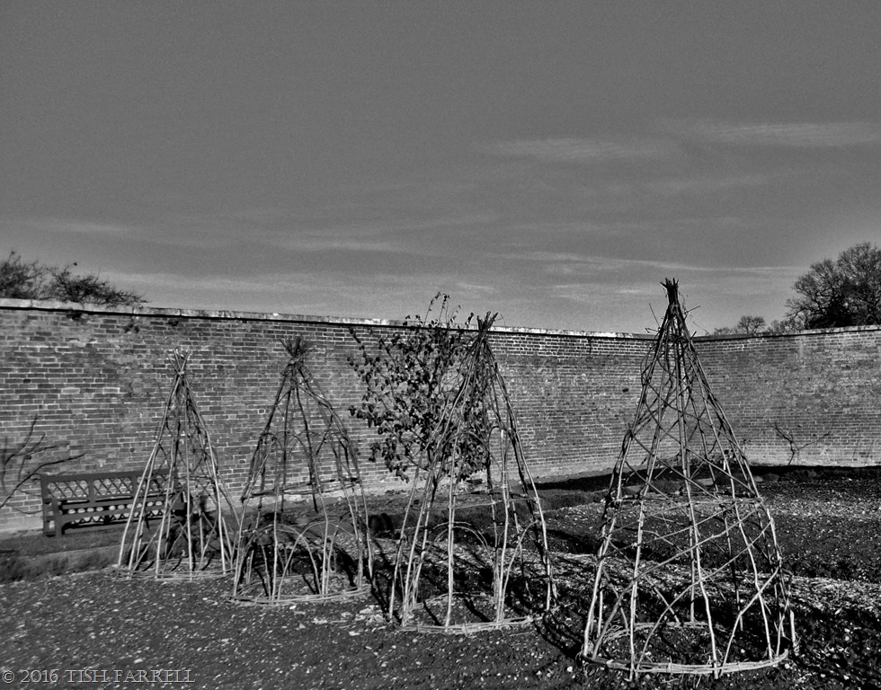 And yes, it was perverse to chose December for our first visit – a time when there is hardly anything growing. However, I was very taken with the climbing bean frames, just visible towards the back wall. Here’s a better view. I think they’re made from hazel whips. Ideal for sweet peas too.