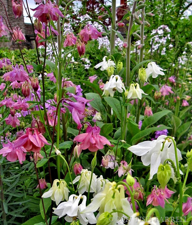 You can’t have too many, can you? Aquilegias that is, aka Columbine or Granny’s Bonnets. They self-seed all over our garden, and also outside the back fence where we have a self-gardening border between us and the field. Dame’s violet, feverfew, purple toadflax, moon daisies, corn cockle and foxgloves are the other vigorous self-sowers. The Dame’s violet in particular is welcome for its fabulous scent. This year most of the plants have come up white. Last year they were mostly pinky-mauve as the plant in the next photo. I like the way they give us a change of scheme: