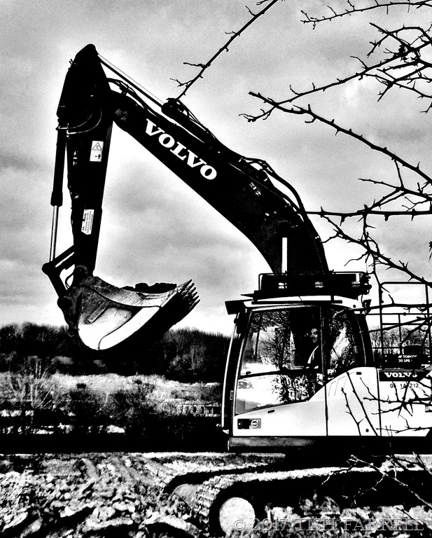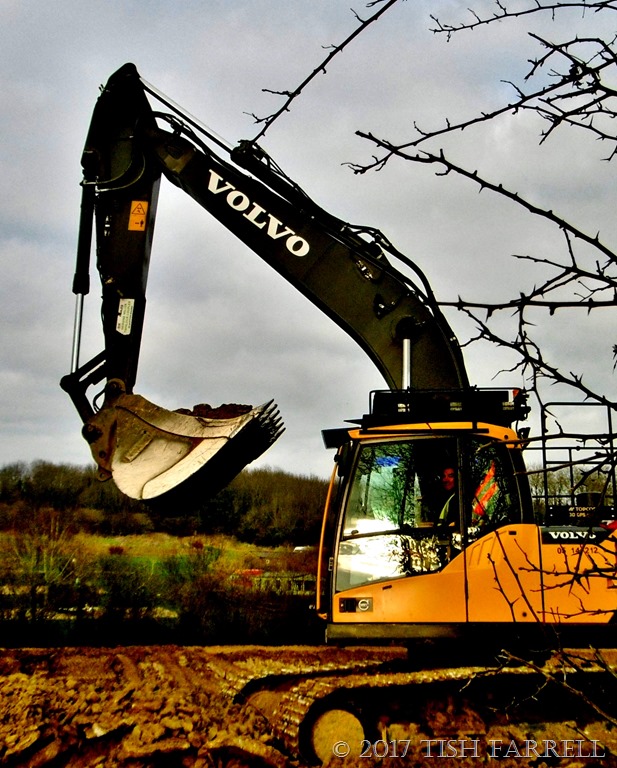 Meanwhile, my chippings collecting habit had not gone unnoticed. Late one afternoon in April, and after the working day was over, I was plodding up the path with a full bag when a truck pulled up on the field track that the construction crew were using. It was the digger driver in the photo. A very Welsh digger driver. At first I didn’t quite grasp what he was saying. I thought he’d come to tell me off. But that wasn’t it.