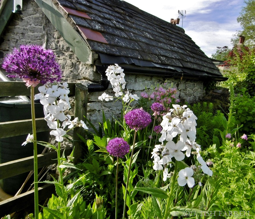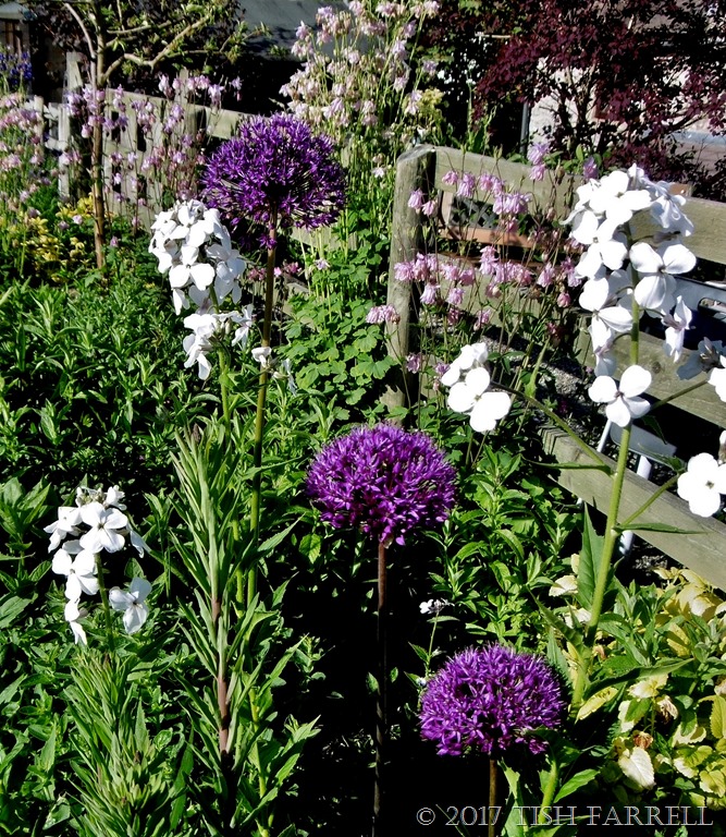 The border isn’t entirely made up of DIY flora. I have put in a few perennials, along with spreading useful herbs – various mints, oregano, lemon balm and marjoram. This year too, some left over allium bulbs put in 18m months ago, are making a nice show – quite unplanned planting scheme-wise.  They were planted in the places where I could get my trowel in the soil.