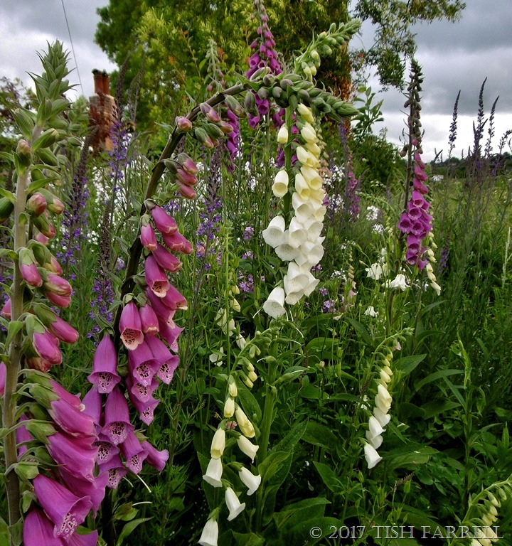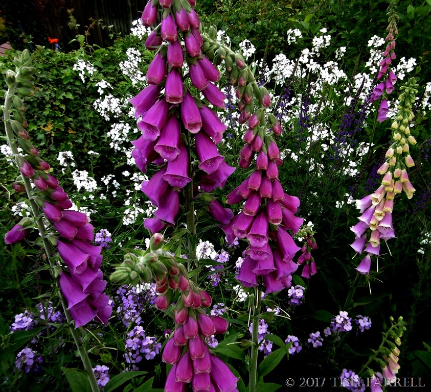 The white foxgloves are lovely too. They have lime green speckles inside each flower.