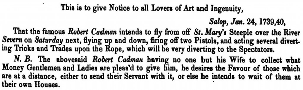 His usual act is to ascend bare-chested, performing all kinds of stunts as he goes. When he performed in Derby this walk took around an hour. The return descent, or flight as it was termed then (since there was apparently quite a yen for this kind of flying  in the early 18th century), would be swift. For this part of the act our intrepid performer puts on a wooden breastplate which has a groove cut down the middle. He then lies on the rope and hurtles down, headfirst, blowing a trumpet, and accompanied by a stream of smoke as his breastplate burns with the friction of the rope. Whew!