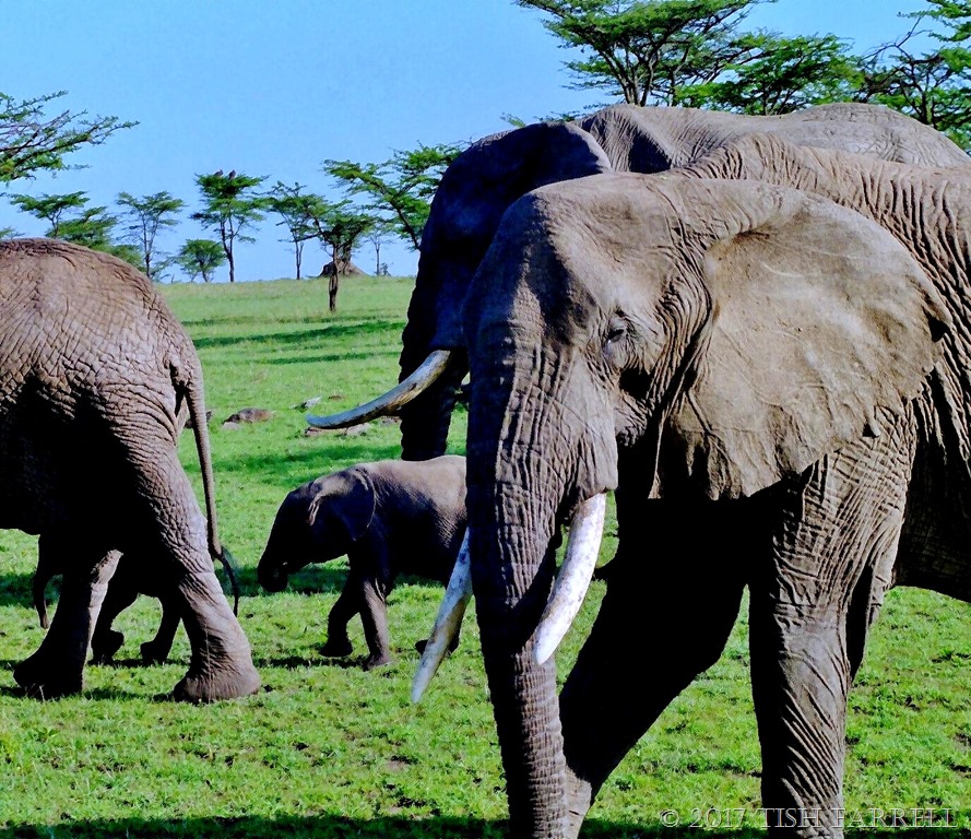 They paid us no attention whatsoever. All we sensed was a wave of communal intention as they headed on through the thorn brush. In fact we were so beneath their notice, Daniel, our driver-guide, decided it would be fine to stop the truck and eat our picnic breakfast as the elephants moved on by. I remember thinking how incongruous it was to be standing out on the Mara plains eating a hard boiled egg while these majestic creatures slowly passed me.