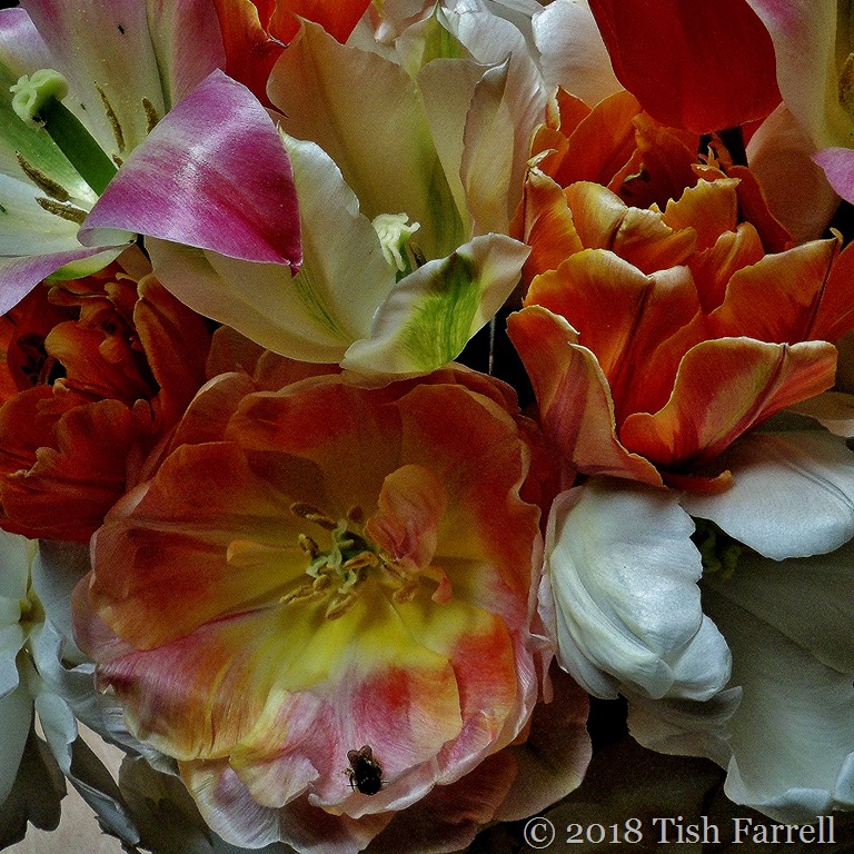 Well, it’s almost a circle, this gorgeous tulip. And it does come with its own bee. And I’m sure everyone who has had fun with March squares in squares and circles in squares will want to say a big ‘hurrah’ and thank you to BeckyB for keeping us so alert and amused with this challenge even as she’s moved between two countries and not been very well.