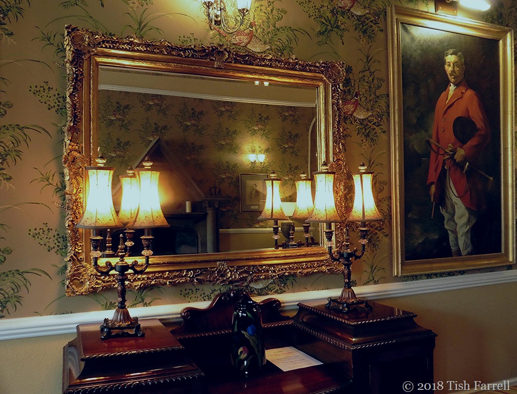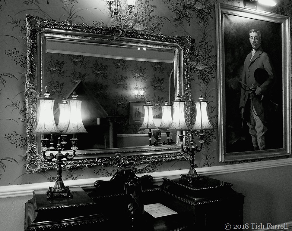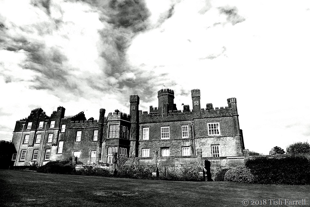 Over at Lost In Translation, one of Paula’s recurrent themes is the conversion of a colour image to monochrome. It’s always interesting discovering what will or will not work; which details become more or less significant. Sometimes there are quite striking and unexpected differences in mood. All of which is to say, I’m not sure why I even thought of converting this first photo to monochrome. As an indoor, night-time shot with too many light sources, I wasn’t expecting it to work at all. But then I found I rather liked the monochrome version. It somehow has a more formal or stately feel about it. It was taken in the hall-drawing room of St. Bride’s Castle.