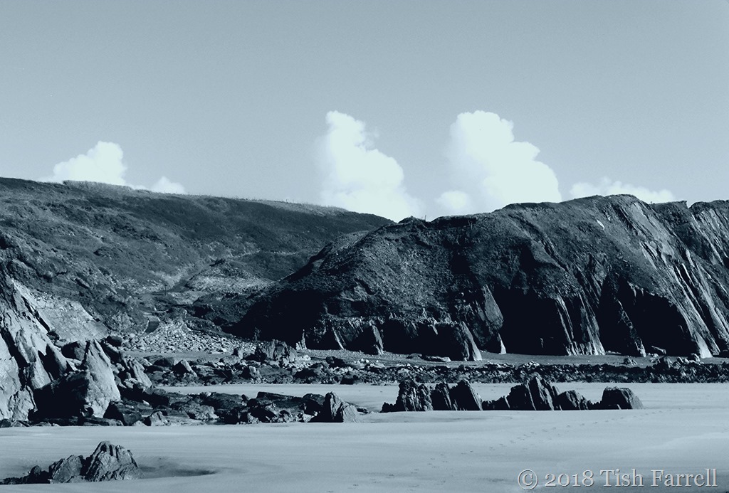 Marloes Sands must count among the world’s stunning beaches, and it is good to know that it, and its approaches are safely in the care of the National Trust. The beach features in my new header photo, taken by he who builds sheds and binds books and only sometimes gets his camera out. His photo is responsible for my theme’s new cool blue look. I pressed the ‘match the header photo’ button in the WP customize menu, and hey presto! It is now causing me to try out my monochrome shots with a ‘blue rinse’ edit.