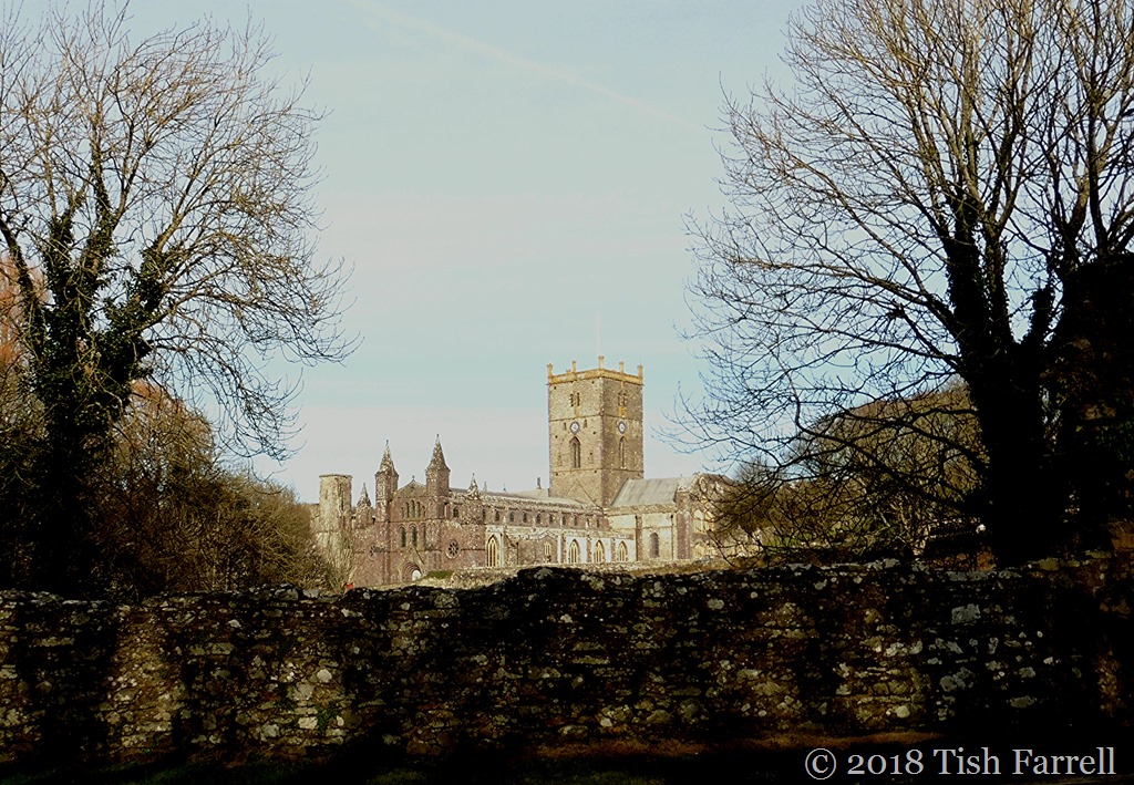 These ruins of the Bishop’s Palace at St. David’s Cathedral in Pembrokeshire, South Wales stand on the site of the monastery of Menevia founded in the 6th century by St. David, patron saint of Wales (500-589 CE). The nearby cathedral (coming up below) was consecrated in 1131, but has undergone many phases of re-building, including major remedial work, first after an earthquake c 1247, and then after the devastation wrought under Cromwell’s Commonwealth of the 1650s. Welsh architect John Nash oversaw extensive repairs in 1793, but his work, proving substandard, made it necessary for the whole cathedral to undergo complete restoration by George Gilbert Scott in the late 19th century. A bit of a mash-up then, architecturally speaking – Gothic and Perpendicular not the least of it – but still an imposingly handsome building. It also hosts a very excellent cafeteria.