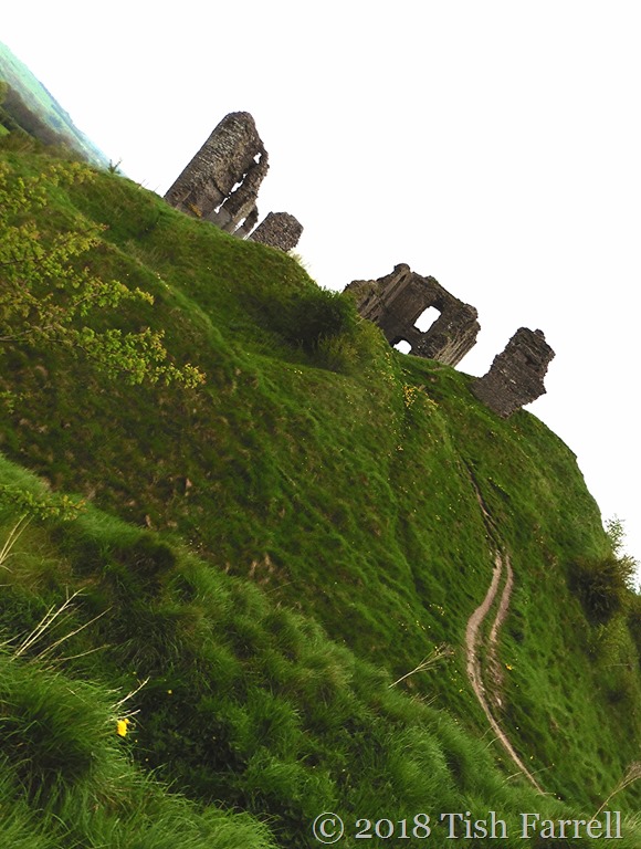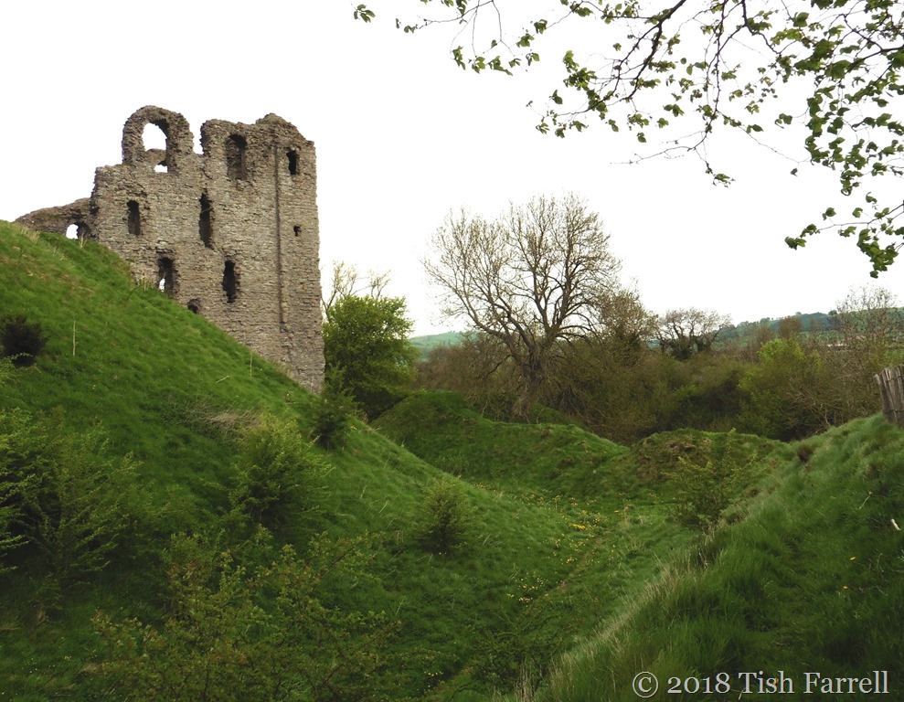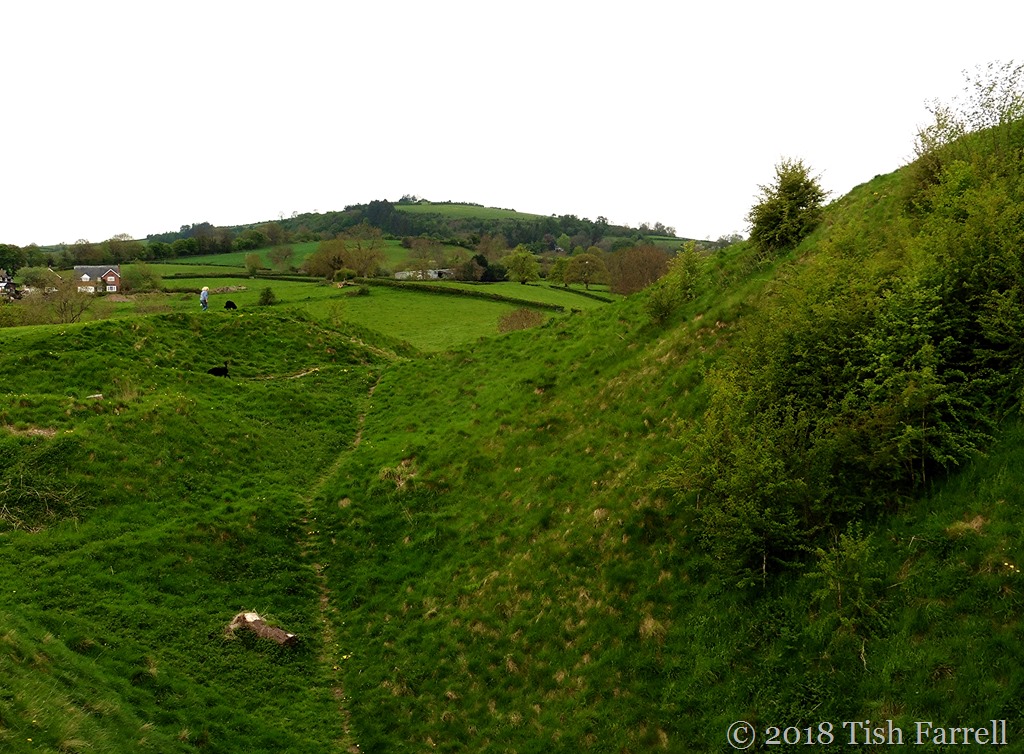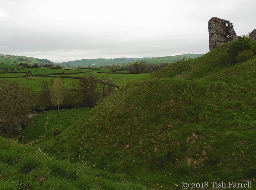 We had saved the best of this visit until last. Because Clun also has a castle – or at least some very dramatic ruins thereof. The only problem was, by the time we reached it, the weather gods had opened the door and let winter back in. So much for the Green Man’s conquest of the Ice Queen. Not only was it too cold to explore – the sudden wind cutting us in half, but the light was very poor. So these next photos only give a quick view of this ancient Norman motte and bailey fortress. But just look at the scale of the earthworks – and think of the enforced human-power necessary to construct them.