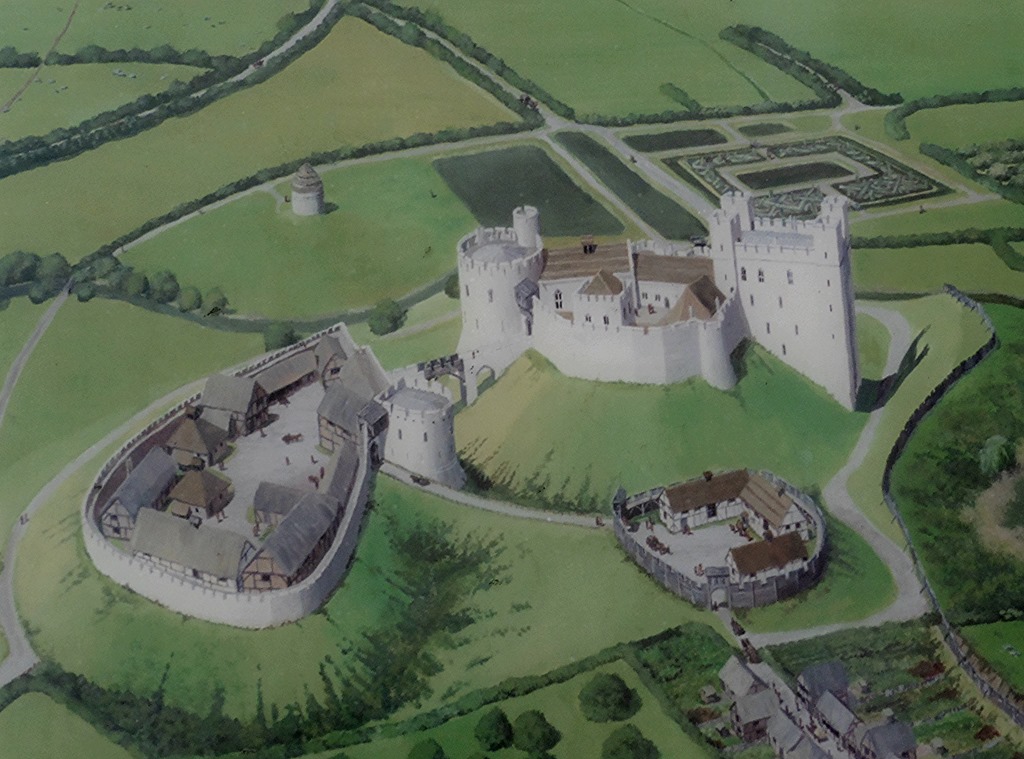 English Heritage kindly provide a visual reconstruction for the year 1300 as drawn by Dominic Andrews, by which time life was less martial in aspect, and lords in castles also went in for pleasure gardens. You can see them in the right hand top corner. The castle also had its own farm (bottom right) and accommodation with associated trades for the soldiers and servants (left outer bailey).