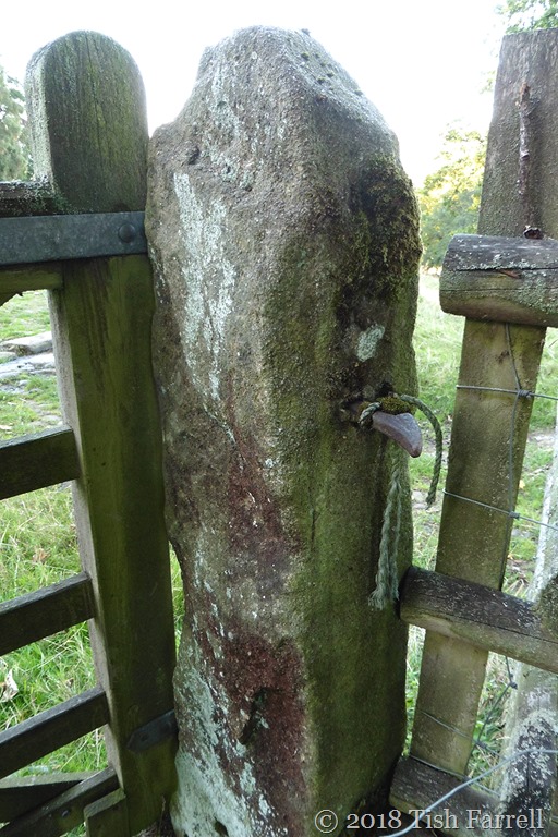 Anciently, the Gates in the Peak Hundreds were formed and hung without any iron-work, even nails, as I have been told; and some yet remain in Birchover and other places, where no iron-work is used in the hanging: a large mortise-hole is made thro’ the hanging-post, perpendicular to the plane of the Gate, at about four feet and a half high, into which a stout piece of wood is firmly wedged, and projects about twelve inches before the Post; and in this piece of wood, two augur holes are made, to receive the two ends of a tough piece of green Ash or Sallow, which loosely embraces the top of the head of the Gate (formed to a round), in the bow so formed : the bottom of the head of the Gate is formed to a blunt point, which works in a hole made in a stone, set fast in the ground, close to the face of the Post. It is easy to see, by the mortise-holes in all old Gate-Stoops, that this mode of hanging Gates was once general.