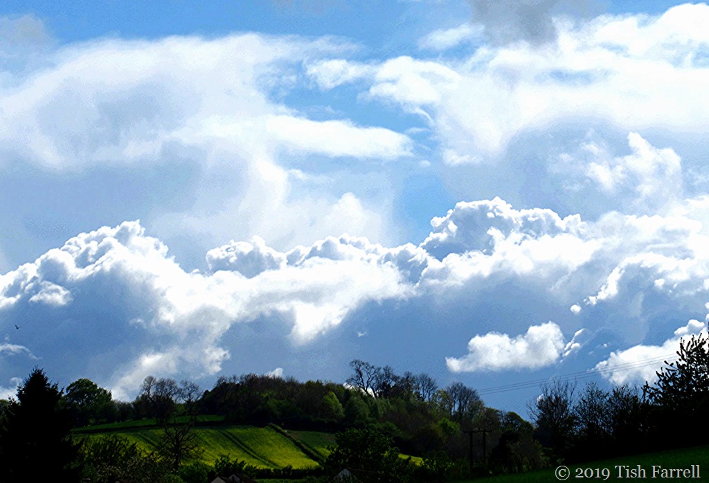 Our cottage is rather short, the upstairs rooms being contained mostly by open roof space rather than walls. Also, the house itself is set in the side of a steep bank between Townsend Meadow and the main road, which means the best views  (our only good ones) are from the bedroom roof-lights. These windows all face west and overlook the field towards Wenlock Edge and the big sky above.