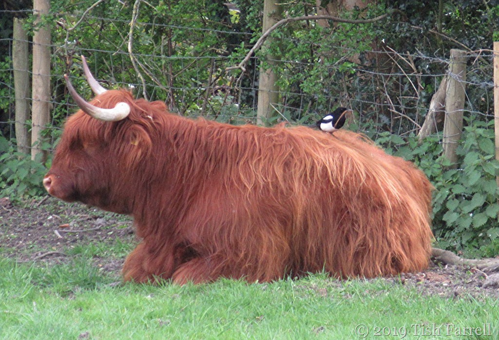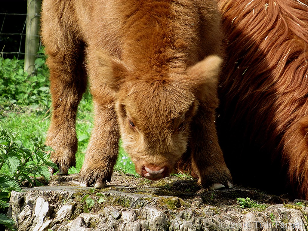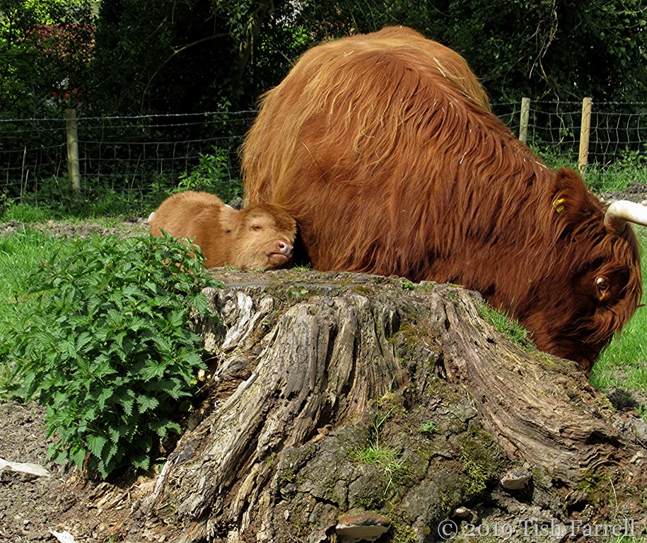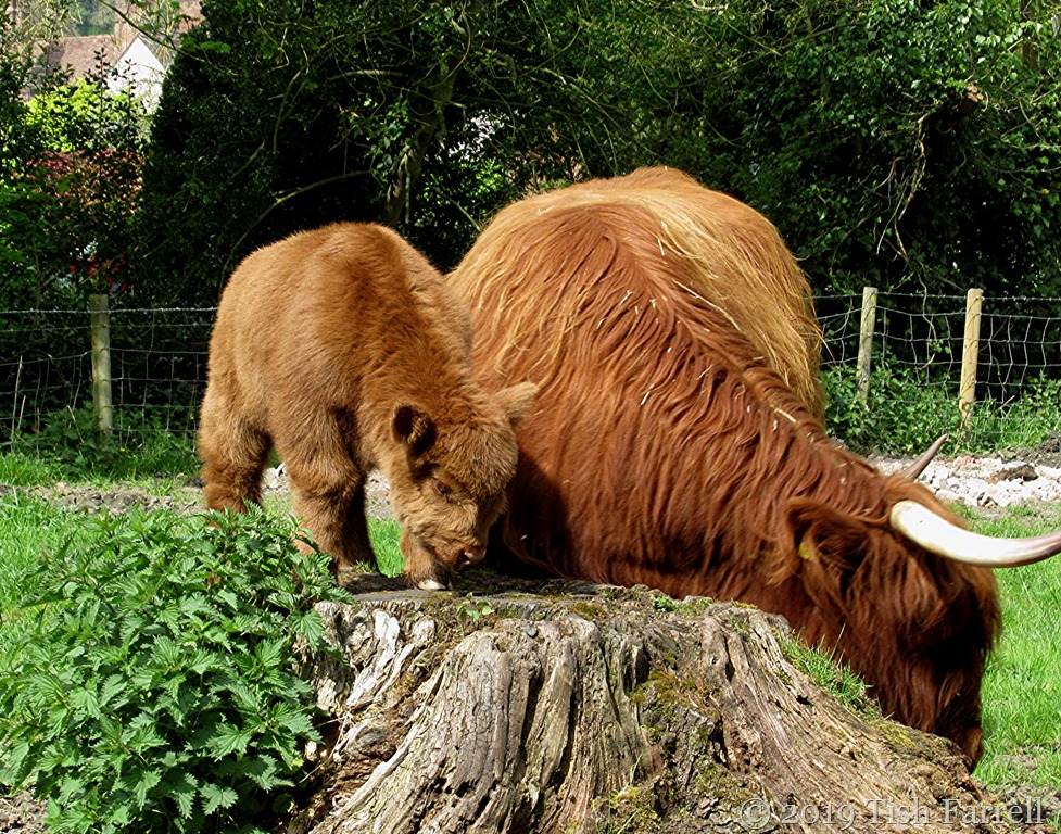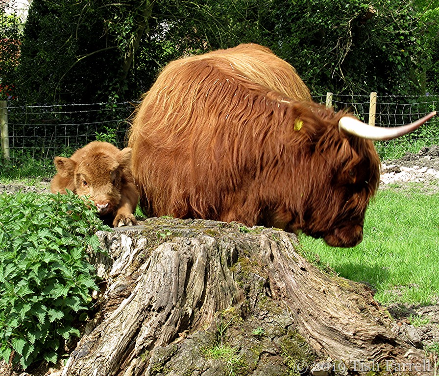 Also this week we have a new Highland bull calf in the Cutlins meadow. This morning as we were lingering on the path watching him, an elderly Wenlockian passing with her West Highland terrier informed us that the proud mother is a Welsh champion. We agreed she certainly has a fine set of horns, but she doesn’t strike us as the sort of cow who would be much impressed by awards. While we were there she was anyway much engaged with a tree stump trying to relieve a very tenacious itch. Meanwhile young MacMoo was attempting to muscle in on the scene.