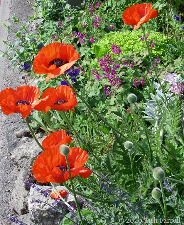 Our cottage faces east and so has full-on morning sunshine, and here it is filling the oriental poppies – a sort of natural neon effect as they sway in the breeze. They are right beside the main road, which is growing busier by the day now that lockdown strictures are easing. But the increase in traffic isn’t cramping the poppies’ style. Lots more buds set to open, and that will definitely please the bumble bees.