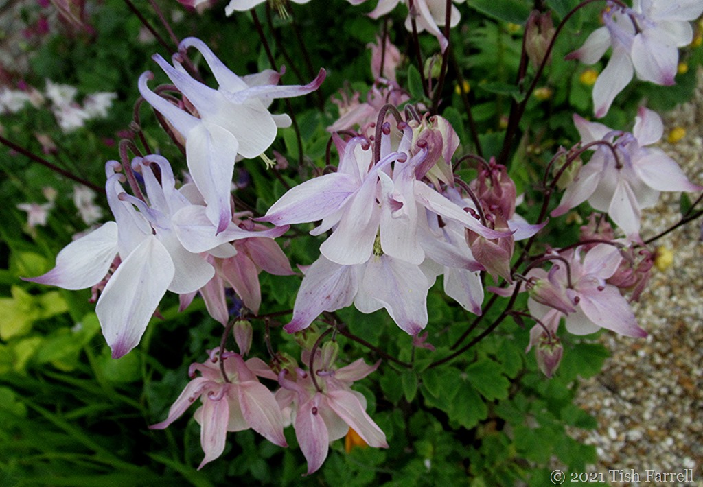 With the May rains came the columbine invasion. It happens every spring, and you never know where they will pop up next, but this year they have excelled themselves and are everywhere: over the back fence in the guerrilla garden, in the front bed beside the main road, in the paving outside the kitchen door, along the top terrace. And in all shades. They are very promiscuous. I’ve also grown some species aquilegias from seed, and this year they are flowering for the first time. I’m now wondering if they will ‘co-mingle’ with the local wild bunch and produce even more lovely shapes and shades.