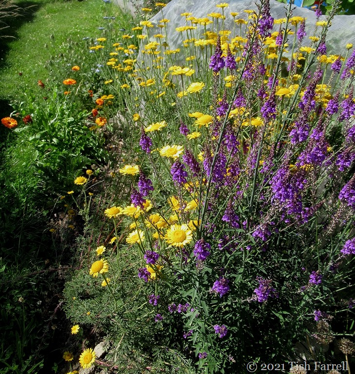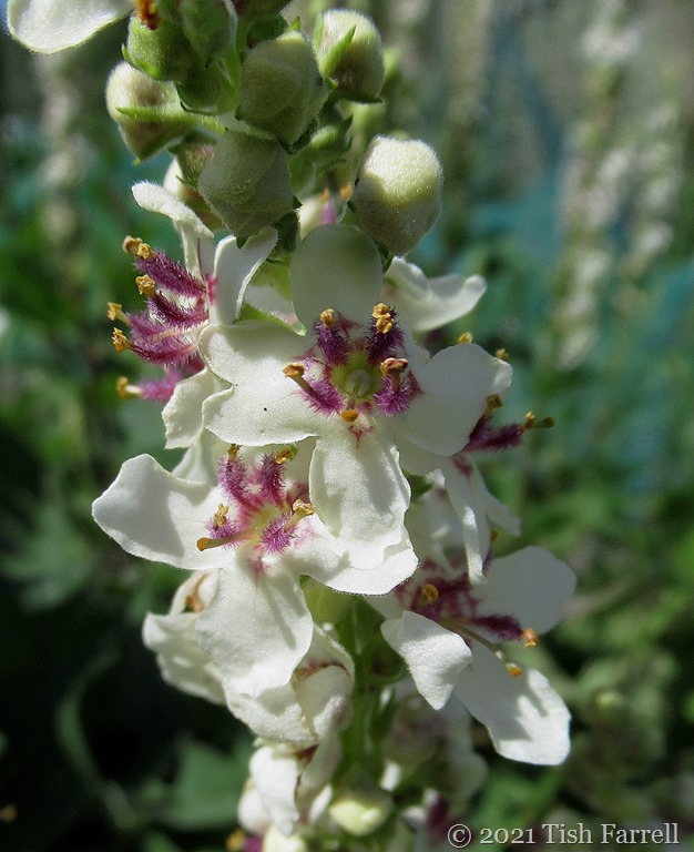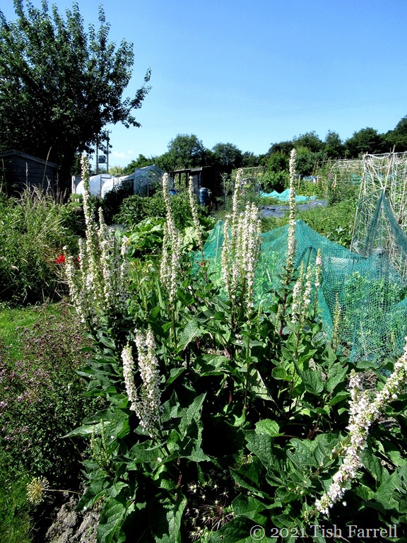 I also have flowers on my plots: some that bring themselves like pot marigolds, purple toadflax, the pale pink musk mallow, and others I have grown from seed e.g. Verbascum Wedding Candles (2nd photo from top) and detail in the next shot:
