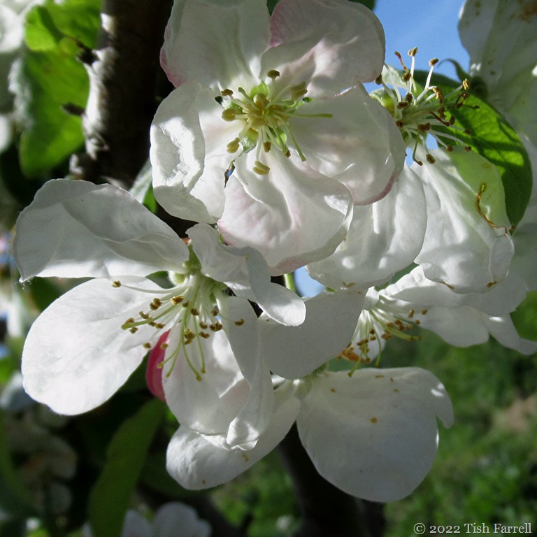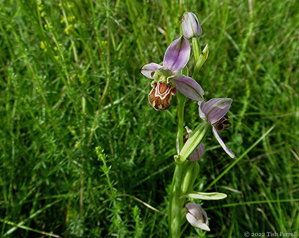 The dark tussocks are heather which will bloom in late summer. The bright green bushes are bilberries, locally called win- or wimberries – our native version of blueberries, ready to pick around August time, but presently flowering. The little rosy bells are hard to see, but the bees are finding them:
