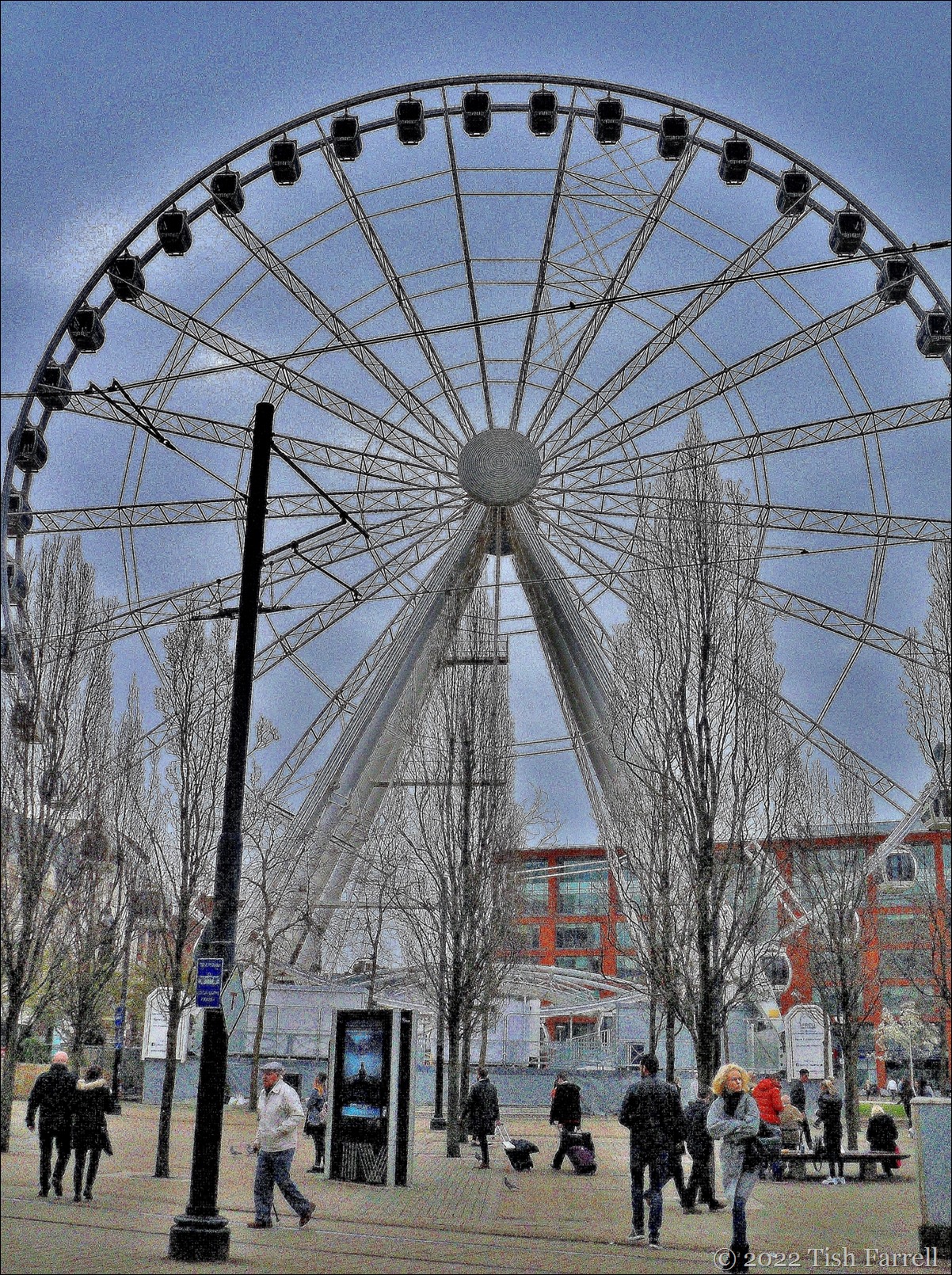 This is the wheel that was, aka the Wheel of Manchester, a version of the London Eye, which was sited in Piccadilly Gardens, Manchester until  2015 when its licence with the City Council expired. This photo was taken in April of that year. It finally came down in the following June. I’m not sure what my camera was doing to produce the washed-out, somewhat retro look, but I rather like it. In fact everything about it says ‘urban’ to me – the sense of detachment/isolation/alienation/coldness; an environment overwrought to the extent of being pointless.