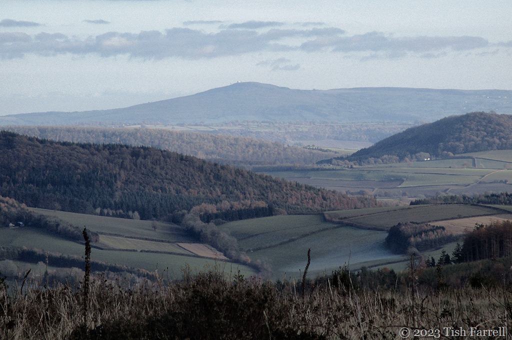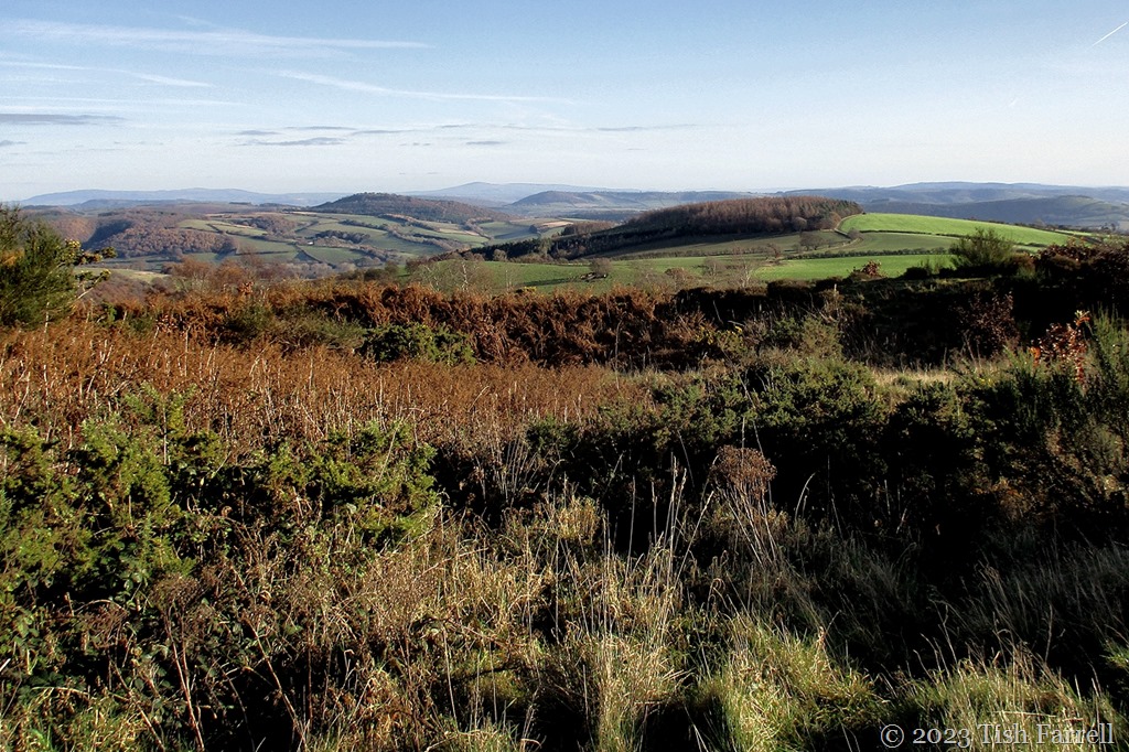 So if I couldn’t quite bring you a hillfort, here are the vistas we enjoyed, looking out, this after perching in a heather clump to eat our packed lunch. Herewith  Shropshire and the Welsh borderland: