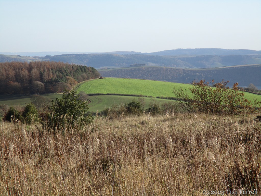 When we reached the hillfort, I tried to capture some idea of how it looks on the landscape, the scale of the ramparts – huge but nonetheless much diminished after 2,000 years of weathering. But it’s always impossible – the light not right, the site too overgrown, the earthworks ill-defined. And then there is the problem of  the enclosed ground: all quite featureless; a great expanse of rough pasture, with nothing to fix on, or frame.