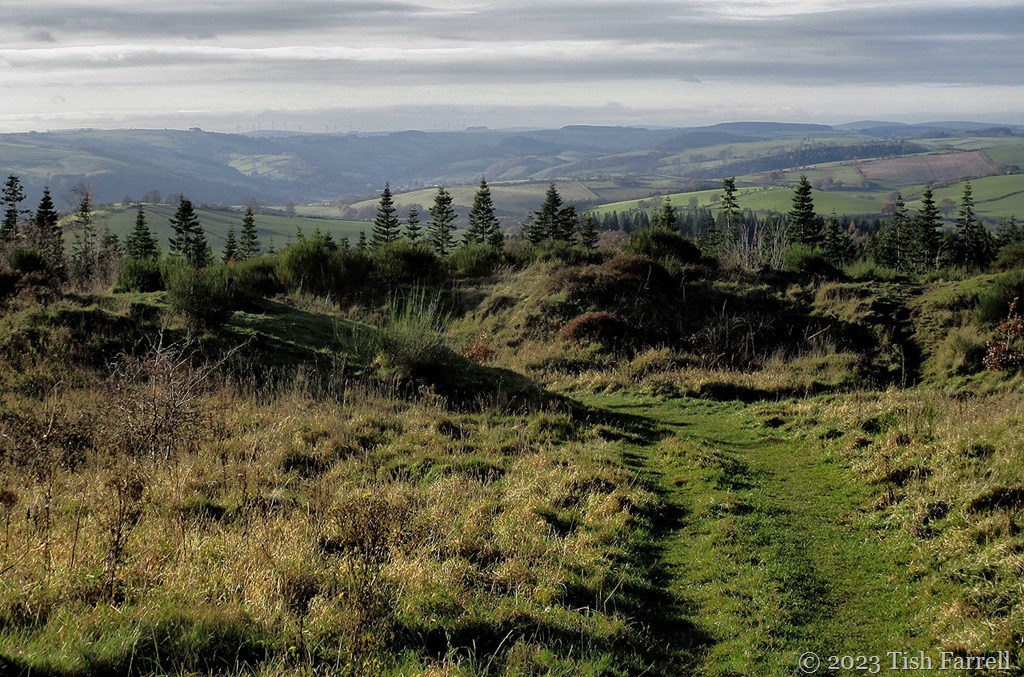 It’s only a five minute drive from our house, but up a very steep hill. For us unseasoned walkers, it’s too far to go on foot. The hillfort lies in Forestry Commission land, which means there is a car park, but the path to it rises further still above ‘monolithic’ stands of conifer, lit up here and there by the odd bright oak, or the orange haze of wintering larch.