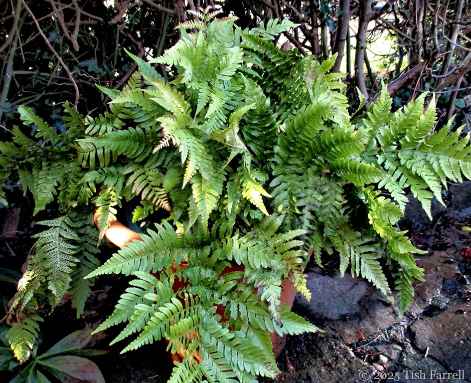 Number 2) is a plant that has made a good recovery after a very unpromising start. Itβs a Japanese Shield Fern I bought on-line back in the spring. After ten days being lost and tossed about by the delivery company, it arrived in very sorry state, much mangled and desiccated. Now it seems very happy in its pot, making new fronds even..