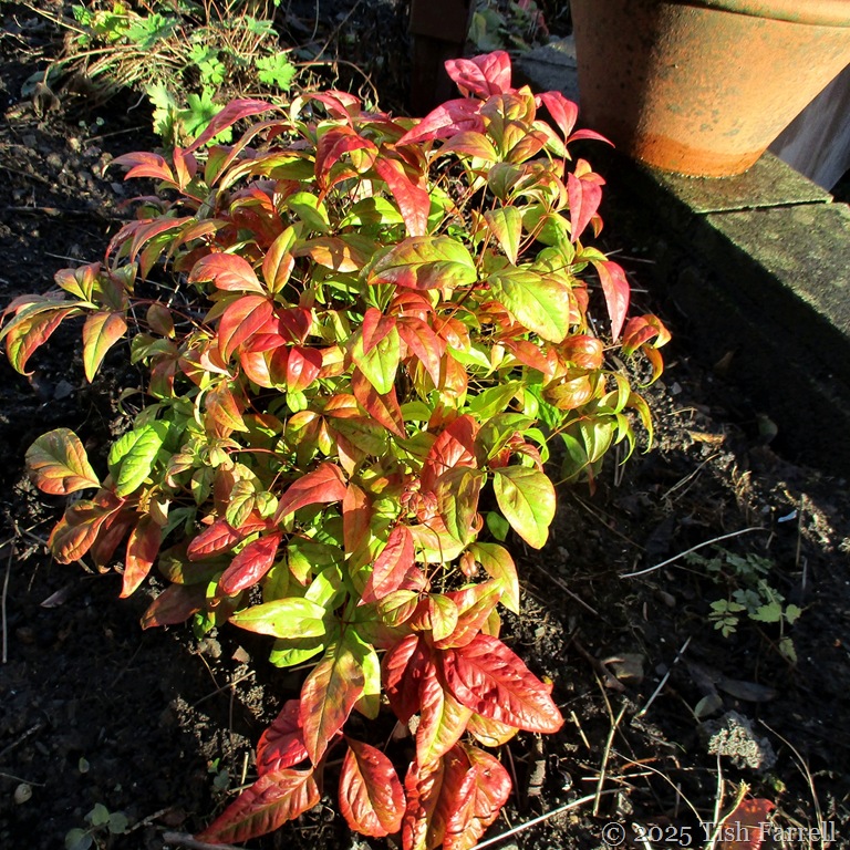 1) Top of the list is Nandina domestica, otherwise known as Heavenly Bamboo. Itβs not a bamboo and so does not have bambooβs bad infesting habit. The variety here is Fire Power. Itβs compact, dome-like in habit, evergreen, and will grow around 18 inches tall with a two feet spread. It likes full sun, but otherwise is undemanding. It also seems unfazed by hard frost (we had several weeks of freezing weather last year). But what colours! It turns more red with the cold weather.