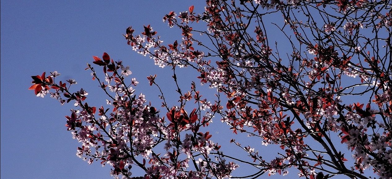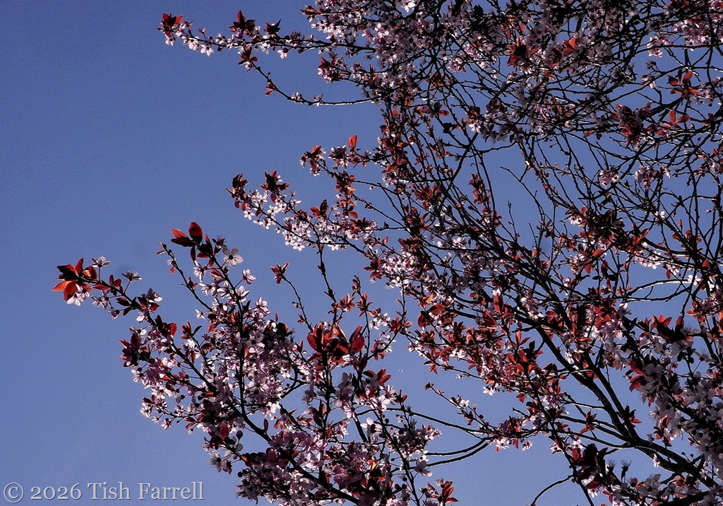 Along the garden path there’s a continuous sprinkling of cherry plum blossoms. The ice pink petals fall like slow snow flakes. On days like this the tree looks its festive best against the sky. It’s not our tree but grows near our hedge, casting the new spring garden of daffodils and hellebores in dappled light.