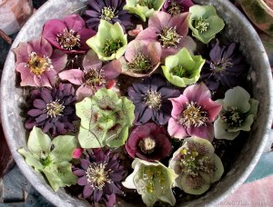 We also came upon a novel way to display (actually get to see) hellebore flowers, which do so hide their faces when growing out in the garden – a shallow dish filled with water: