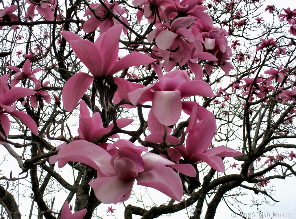 I liked the layered look of the magnolia blossoms near and far against the flat grey sky.