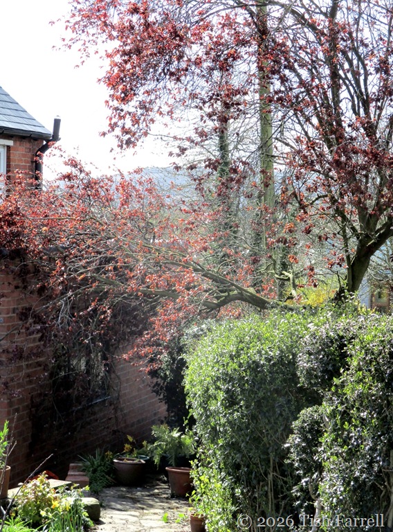 We can now see the retirement home’s almond blossom tree across the road, but the immediate holly hedge view seems rather bleak and gloomy. I’m wondering about having a Japanese Maple in a big pot at the top of the old steps opposite the side window. It’s a semi-shaded, sheltered spot. It might work?