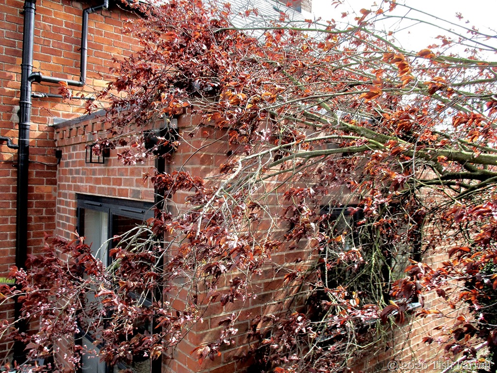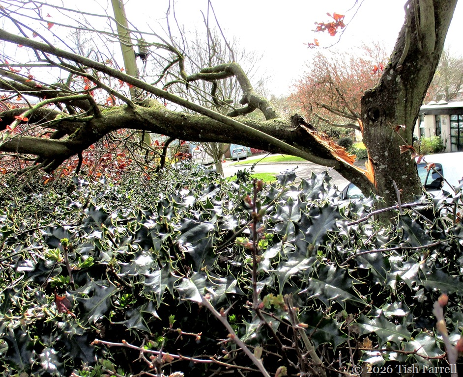 And so to last Saturday’s gale, and good bye cherry plum tree (2). It wasn’t our tree, but it gracefully filled our kitchen window view and we liked to watch it through the seasons. It also made up for the ‘horrid holly hedge’ which we acquired along with the house. On Easter Sunday we woke to this: