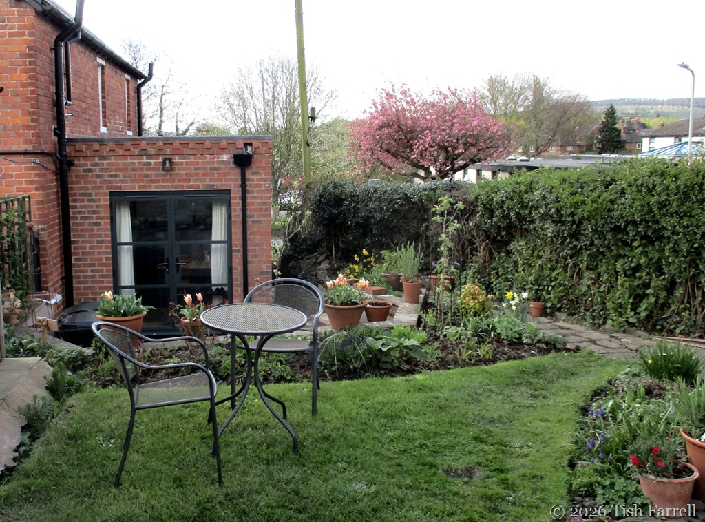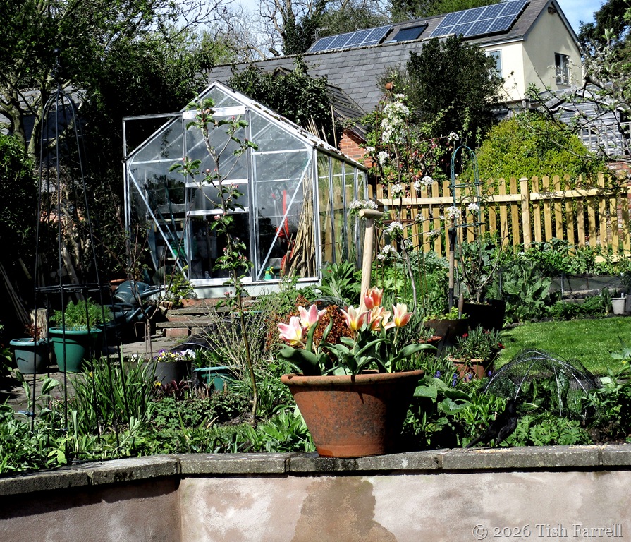 About to flower – a dwarf Christmas Pearmain just visible to the left of the tulip pot.