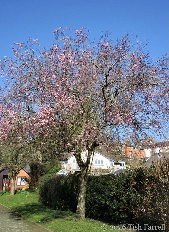 The tree people came this week and cut the whole thing down. They said the remaining trunk showed signs of decay and had to go. There’s no denying it: it’s left a big gap. I doubt that the housing association owners will replace it, planting space being rather limited. Here it is back in March.