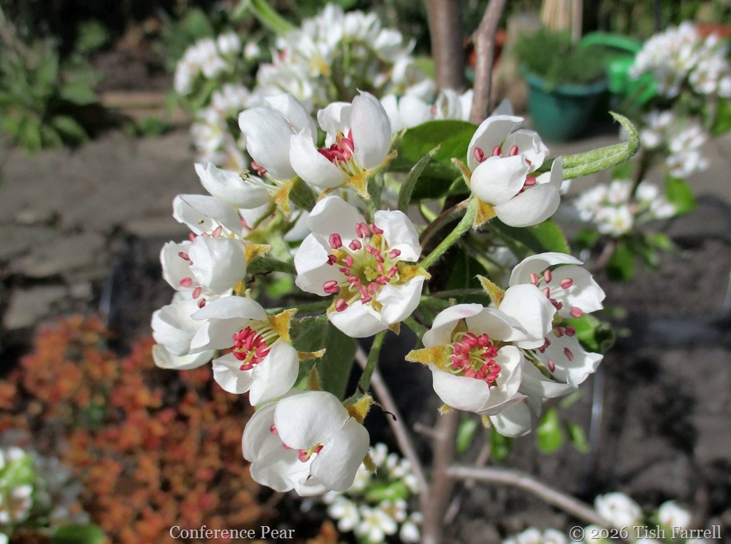 Of miniature trees (3). On a happier note, the garden’s tiny trees seem to be faring well. We don’t have a great deal of space, and although I realise shrubs generally form the ‘spine’ of a garden, I couldn’t get to grips with what to choose or where to put them. Instead, I thought of dwarf trees. The conference pear is the prettiest of them just now. It’s in a raised bed beside the potato patch.