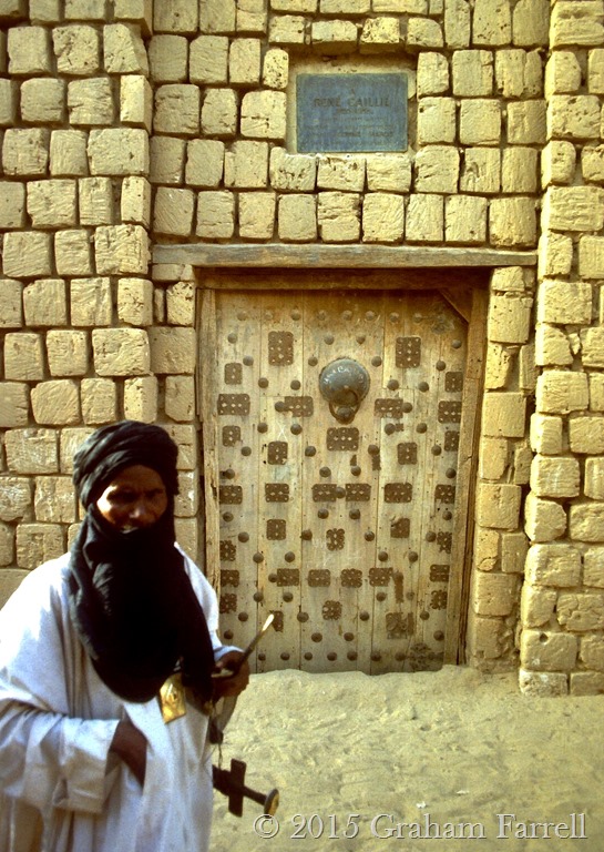The plaque above the door marks the fact that French explorer René Caillié once stayed in this house.  The stay was brief, two weeks in April/May 1827, but he had apparently spent many months in preparation, staying with the Moors in Mauretania, learning Arabic, and converting to Islam so he could pass himself off as an Arab. His objective was to win a 10,000-franc reward offered by the Société de Géographie in Paris, and to do this he had to be the first European to see and return alive from Timbuktu. That he lived to tell the tale is recounted in his work Description de la ville de Temboctou. The rest of his life,  however, was sadly foreshortened by tuberculosis. He died in his homeland of Western France at the age of thirty eight.
