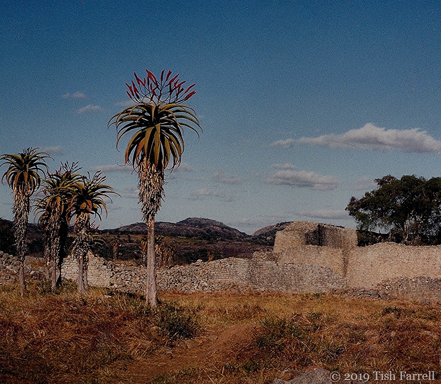 And here’s another painterly ‘in the background’ view: the Great Enclosure of Great Zimbabwe with giant aloes in the foreground. Of course, when it comes to the history of this World Heritage site, ‘in the background’ could well have another  and wholly insidious meaning. When geologist, Carl Mauch, first visited the site in 1871 he was convinced that the massive dry-stone granite walls were the remains of the Queen of Sheba’s lost city of Ophir.  (See also my post on The Swahili). For some decades this view persisted. It was not in the interests of pioneer imperialist Cecil Rhodes for it to be known that Africans had a sophisticated historical heritage. He financed the first excavation by James Theodore Bent whose brief was to ‘prove’ that the complex had been built by the Phoenicians or the Ancient Egyptians. In 1928-9 British archaeologist, Gertrude Caton-Thompson refuted this conclusion, pronounced it African-built but “the product of an infantile mind.”