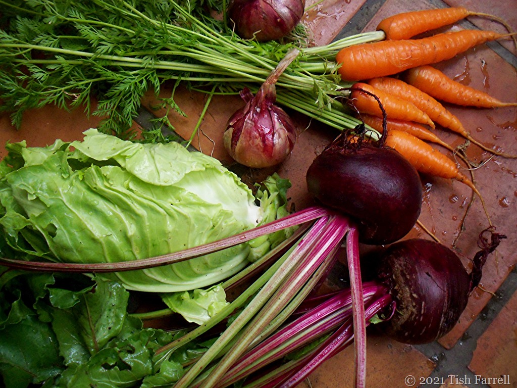 Allotment plots have a tendency to dreariness in the winter months, but the paths had been mowed and some diligent allotmenteers had worked hard to tidy away the listing bean poles and decaying vegetation. I’m afraid I’m not one of them, nor did I feel inclined to make a start yesterday. Instead, I inspected the winter greens, pulled up leeks, prised some container-grown parsnips out of their bucket and gathered rocket, lettuce, parsley, fennel and baby spinach from the polytunnel. There were even a few Sungold tomatoes to pick. Now that was a treat. Then I had natter with stalwart gardener Phoebe, who was on her way home for lunch, and then, guess what…