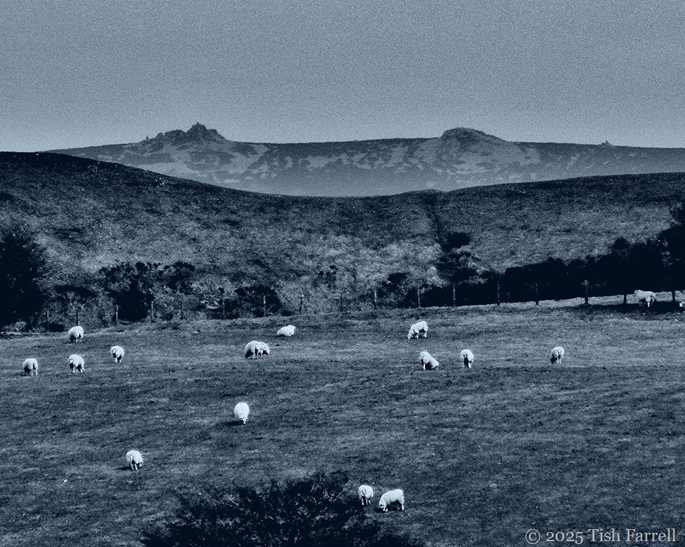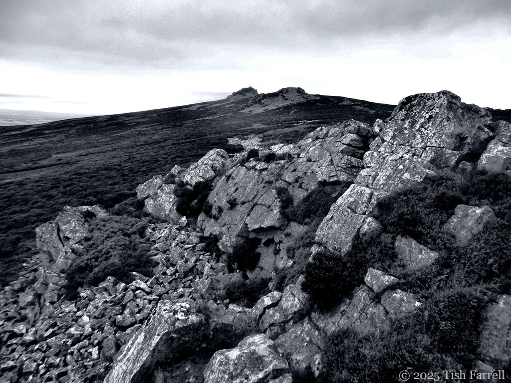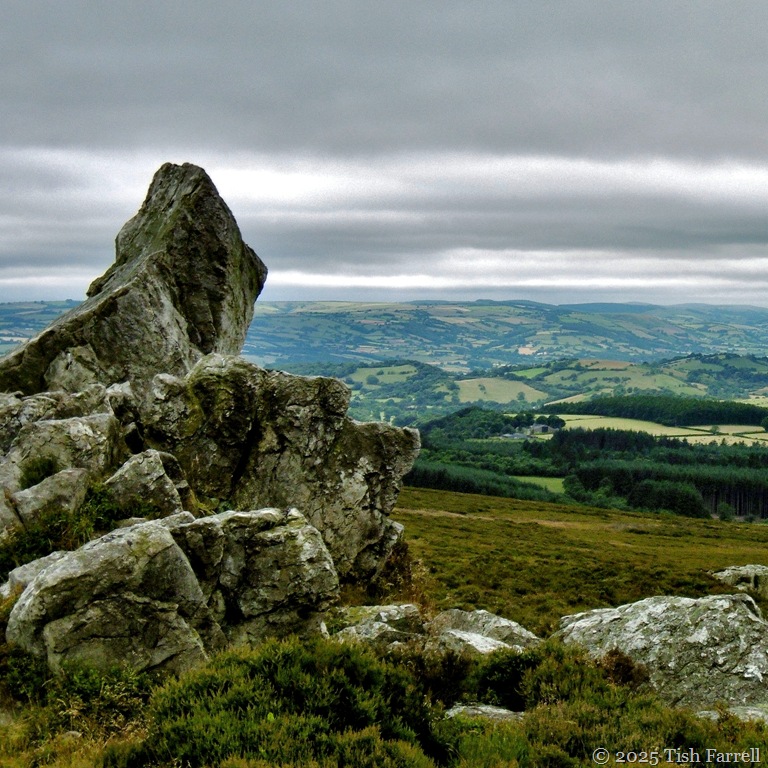 This distant view of the Stiperstones from Mitchell’s Fold stone circle, shows two of the Ice Age tors along the five mile summit, (Manstone the highest point on the left). This hill was probably formed from the laying down of quartzite sand when the whole of Southern England lay in the southern hemisphere, somewhere near the Comoros Islands in the Indian Ocean. That was around 500 million years ago, about the time when it began to move north. The tors themselves were exposed far more recently, by the repeated freezing and melting of glaciers that nudged up against them during the last Ice Age (115,000 to 12,000 years ago).