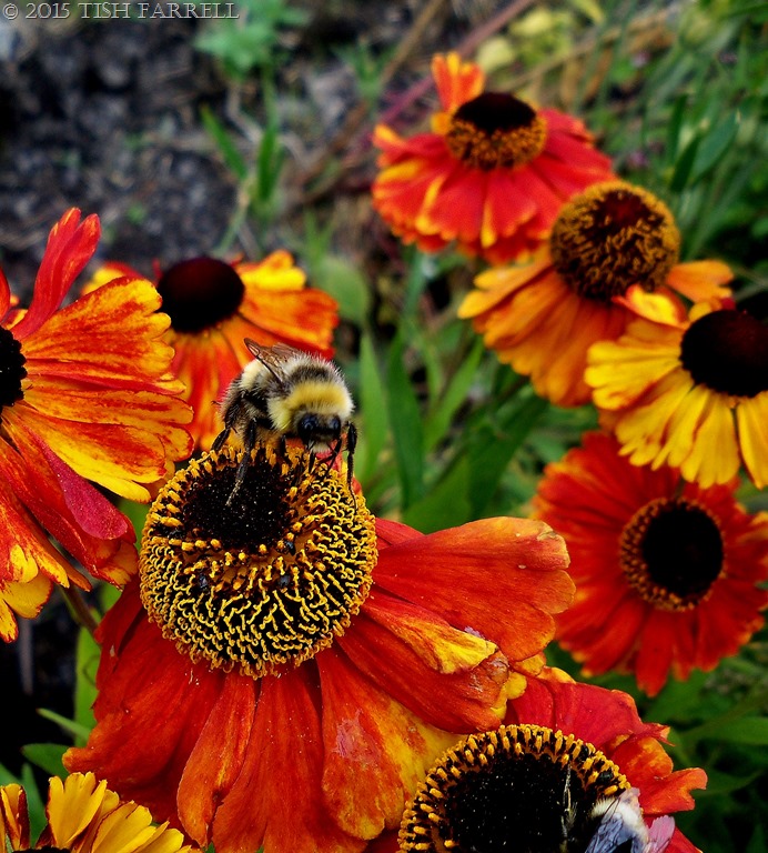 How can a plant so glorious be real? All the flowers in the photos, in all their wonderful variation, are growing on a single plant. And, as you can see, the bumble bees are gorging themselves. There are also some very tiny emerald beetles in amongst the pollen. Sneeze weed, by the way, is a country name for Helenium, which is a far more gracious name for such a generous plant, although one rarely used in the Farrell household.