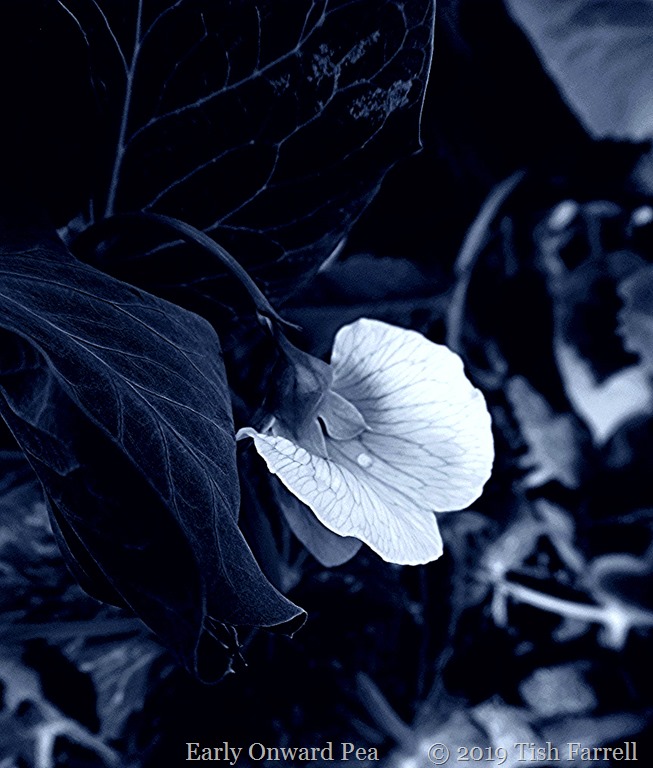Nigella damascena is a wonderfully self-seeding annual that has been grown in English gardens since Elizabethan times. It is much loved for its sky-blue flowers (sometimes also white or pink) and its delicate ferny leaves. And of course, once the flowering is done, there are the strikingly odd sputnik seed capsules to admire.  Though seen here in monochrome (with a hint blue), the flowers already have a distinctly alien look. I took this photo last night at the allotment. I have several self-seeded clumps around the vegetable plots, and they are just beginning to flower. It’s always good to mix things up like this, the flowers not only attracting the pollinators for the fruit and vegetables, but also, in the case of French marigolds, diverting crop pests. And talking of crops, or ones in the making, here’s a rather fine pea flower: