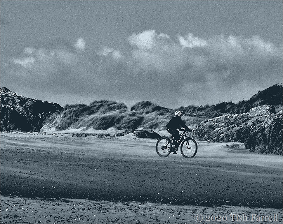 Looking at this photo now I’m beginning to feel envious of this unknown cyclist caught plying Newborough sands a few Christmases ago.