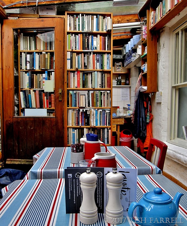 Books, books and more books on every conceivable topic. You could spend days and years here. And the good thing is there’s no need to leave because they feed you too – delicious vegetarian and vegan dishes, produced from behind a bookshelf in what passes for a kitchen.