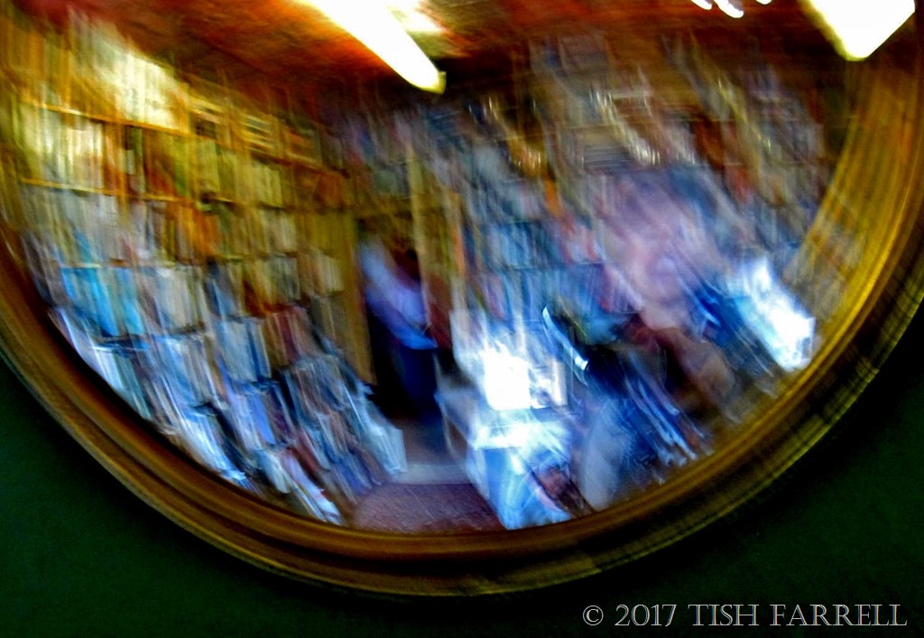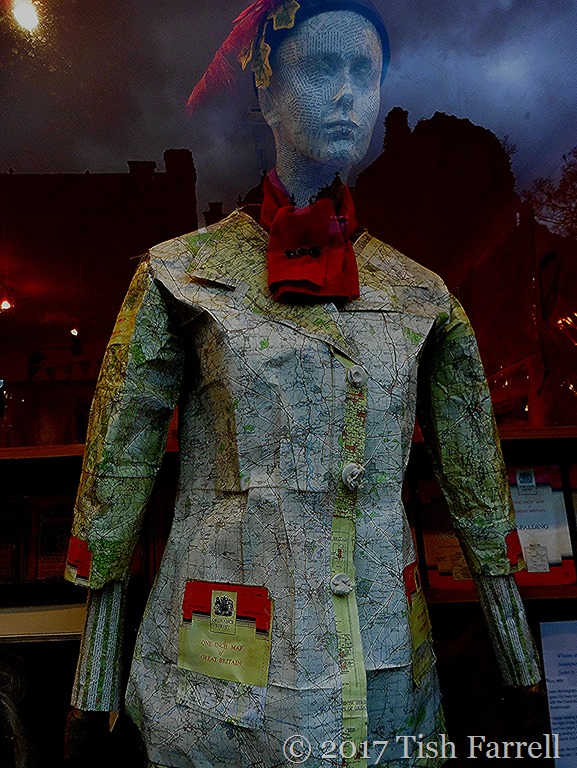 This photo was taken through the window of Mostly Maps and I think it covers all Paula’s word prompts for her December pick a word. Here we have the portrayal of a young woman by a non-human mannequin. She has the most sagacious looks too, clad in the re-worked remains of old ordnance survey maps. There are more remains reflected behind her – the dark silhouette of Hay Castle ruins. And then, here and there, are small stellar bursts from street and Christmas lights. Tarrah!