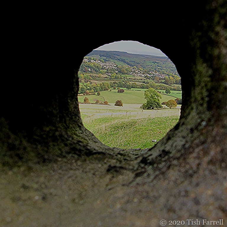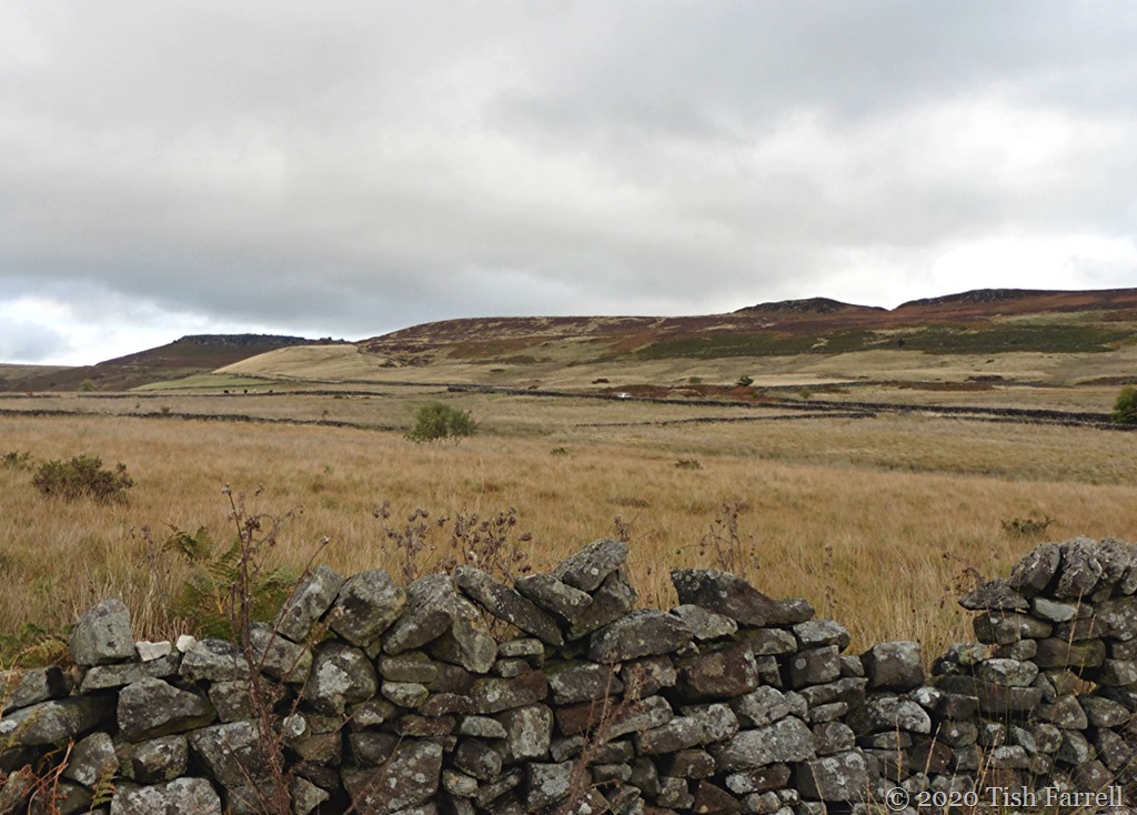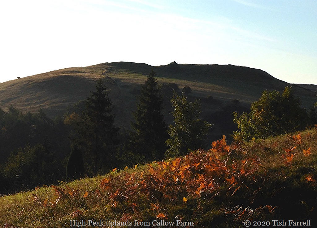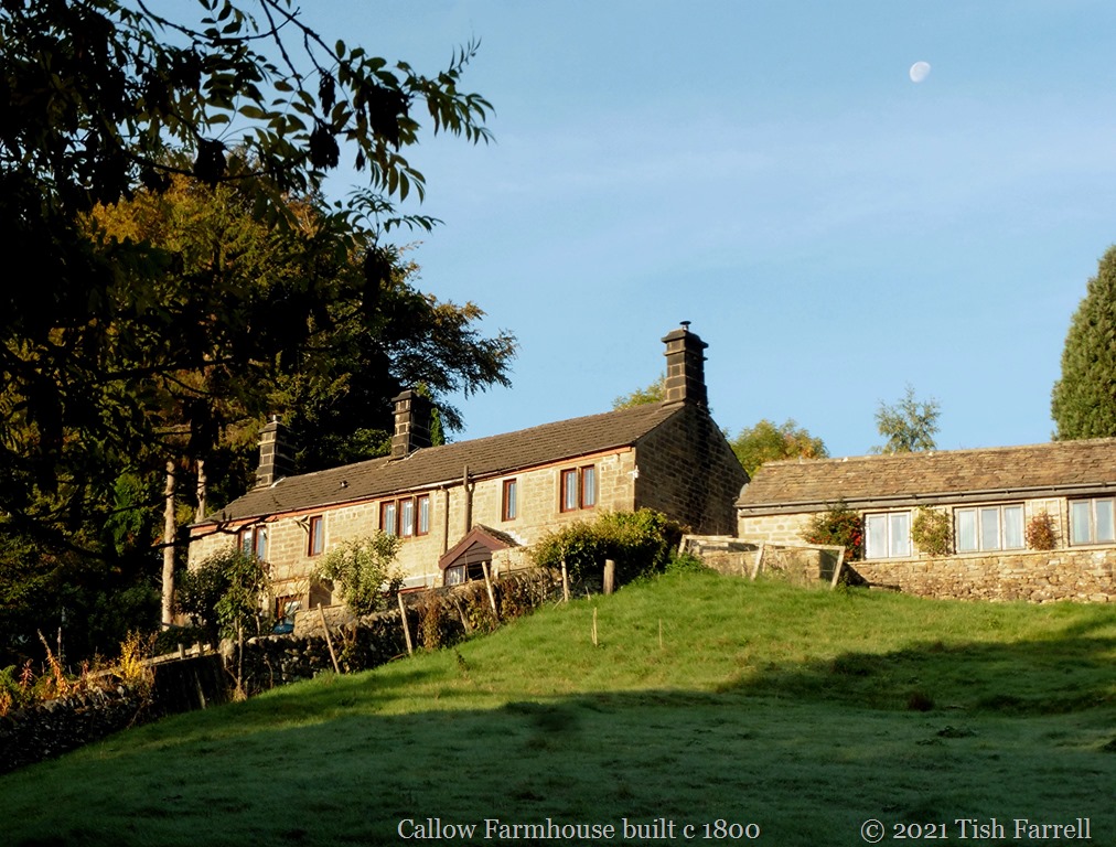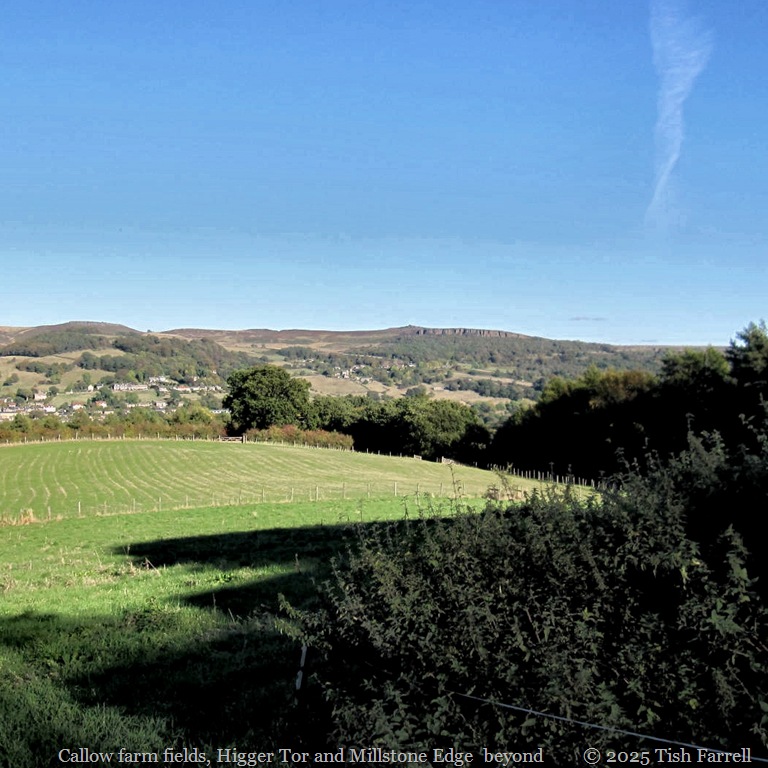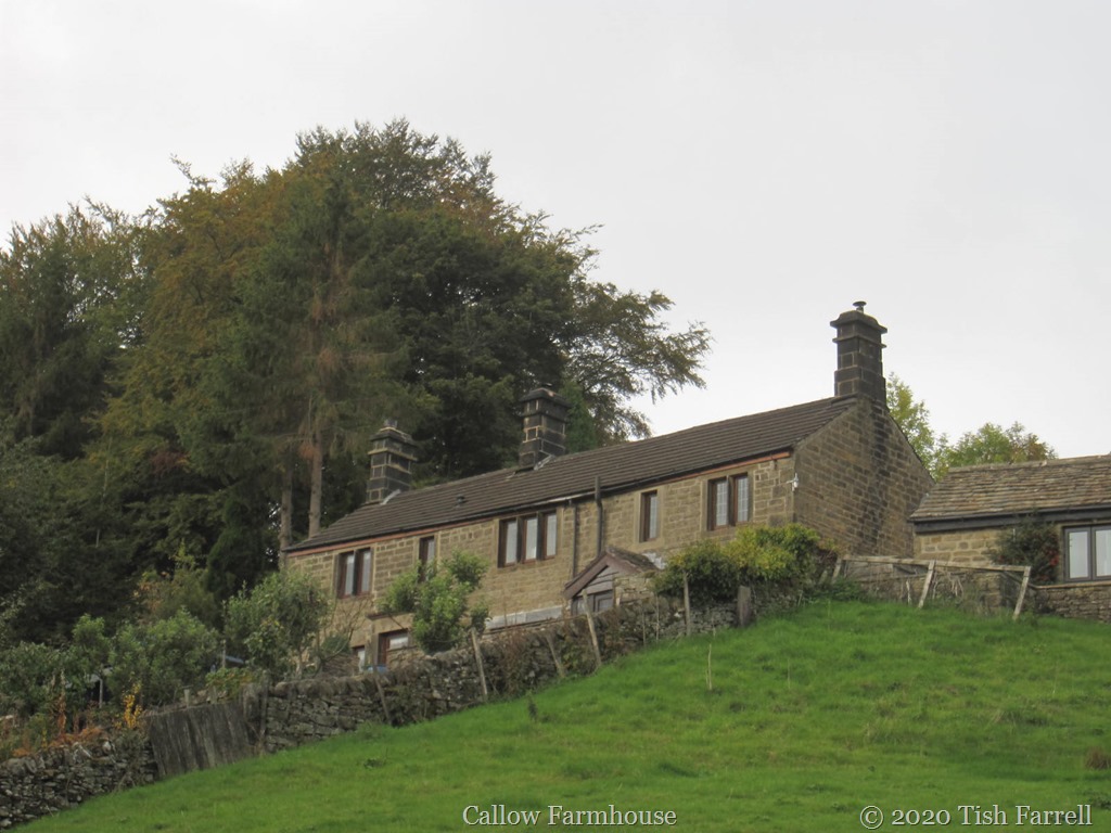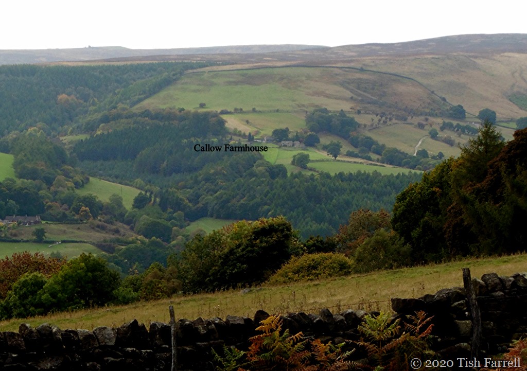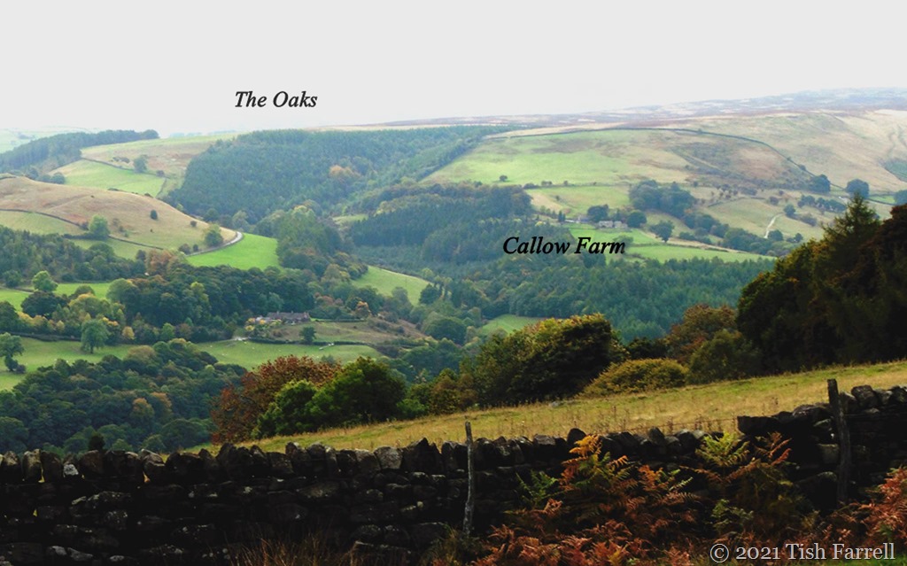 Two Septembers ago when Graham and I walked up the long track to Scraper Low Farm, I again wondered why Sophia had chosen this particular place to settle. It was only when we turned away from the house to retrace our steps that I think I found the answer. At the point where the track dog-legs back towards the road, there is a magnificent view across Hathersage’s Derwent valley. I could see Callow Barns (now a holiday let) where we were staying. Callow Farmhouse itself was now hidden by trees, but I could spot the two conifers at its back gate.