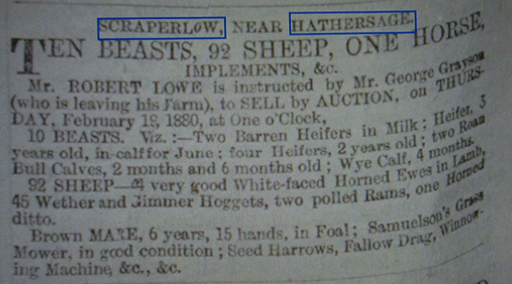 The Barton family, who preceded the Listers, can’t have been at Scraper Low for long because they followed on George Grayson, who was only selling up in 1880. The auctioneer’s notice from the local paper that year gives a nice glimpse of the kind of farm it was: